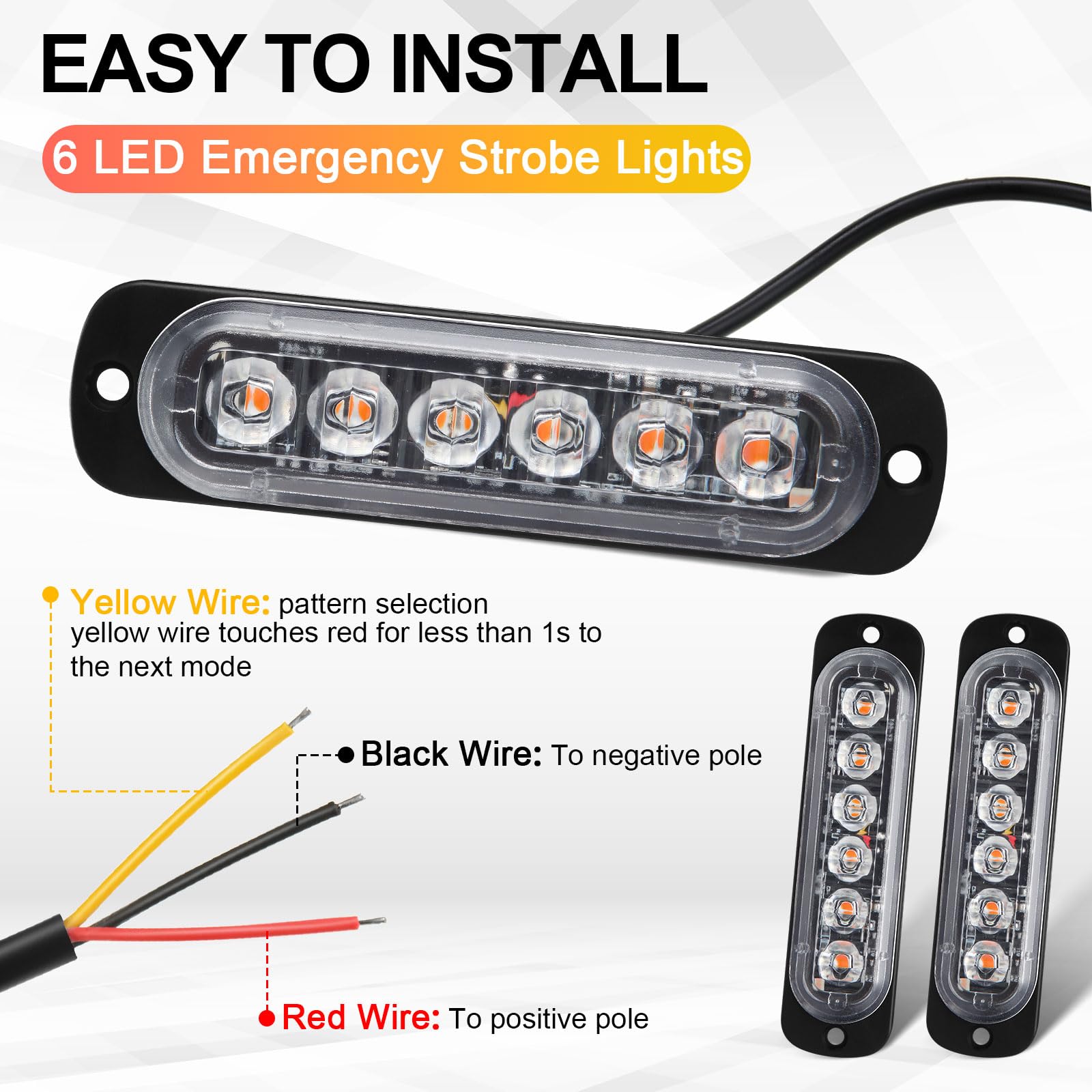 Easy to Install: the LED warning emergency flashing lights have 2 lighting modes, including constantly mode and strobe mode, the red wire cable is connected to the positive pole, the black wire cable is connected to the negative pole, and the yellow wire cable is connected to the positive change flashing mode; When the yellow wire touches the red wire, the mode will be changed, when the yellow wire is released, the mode is fixed
