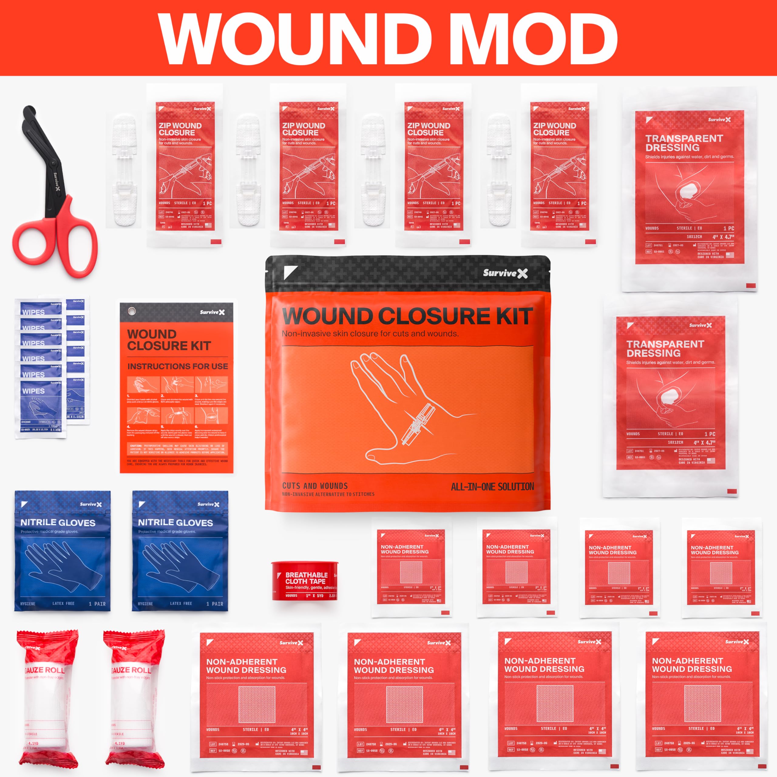 LIFE'S UNEXPECTED MOMENTS — Equip yourself with Survivex Zipstitch Closures, a non-invasive, painless alternative to stitches for treating small cuts and lacerations. First aid Kit is perfect for emergencies at home, work, or during outdoor activities like hiking, camping, or biking. Designed in Virginia. FSA HSA Eligible.