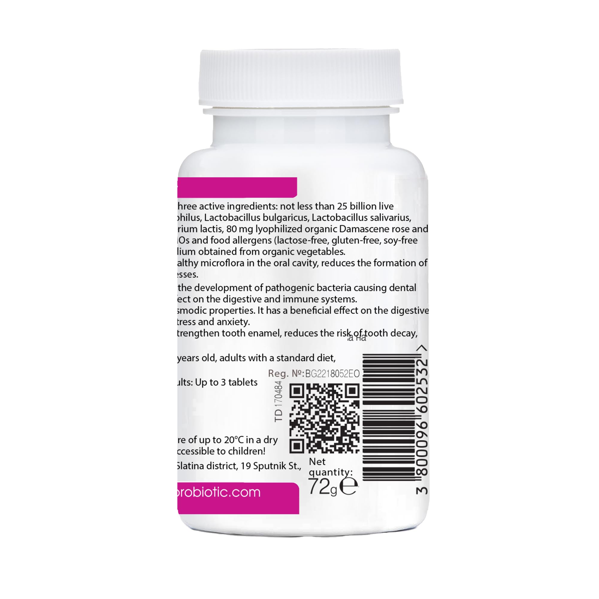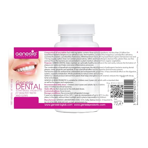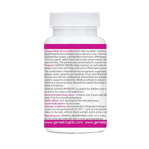 Vegan Probiotic GENESIS DENTAL is an innovative suckable probiotic with action aimed at dental health. It helps maintain an optimally healthy microflora in the oral cavity, reduces the formation of plaque and caries. The probiotic takes care of fresh breath. It has a beneficial effect on the digestive and immune systems. It is enriched with Rose Damascena and xylitol.
