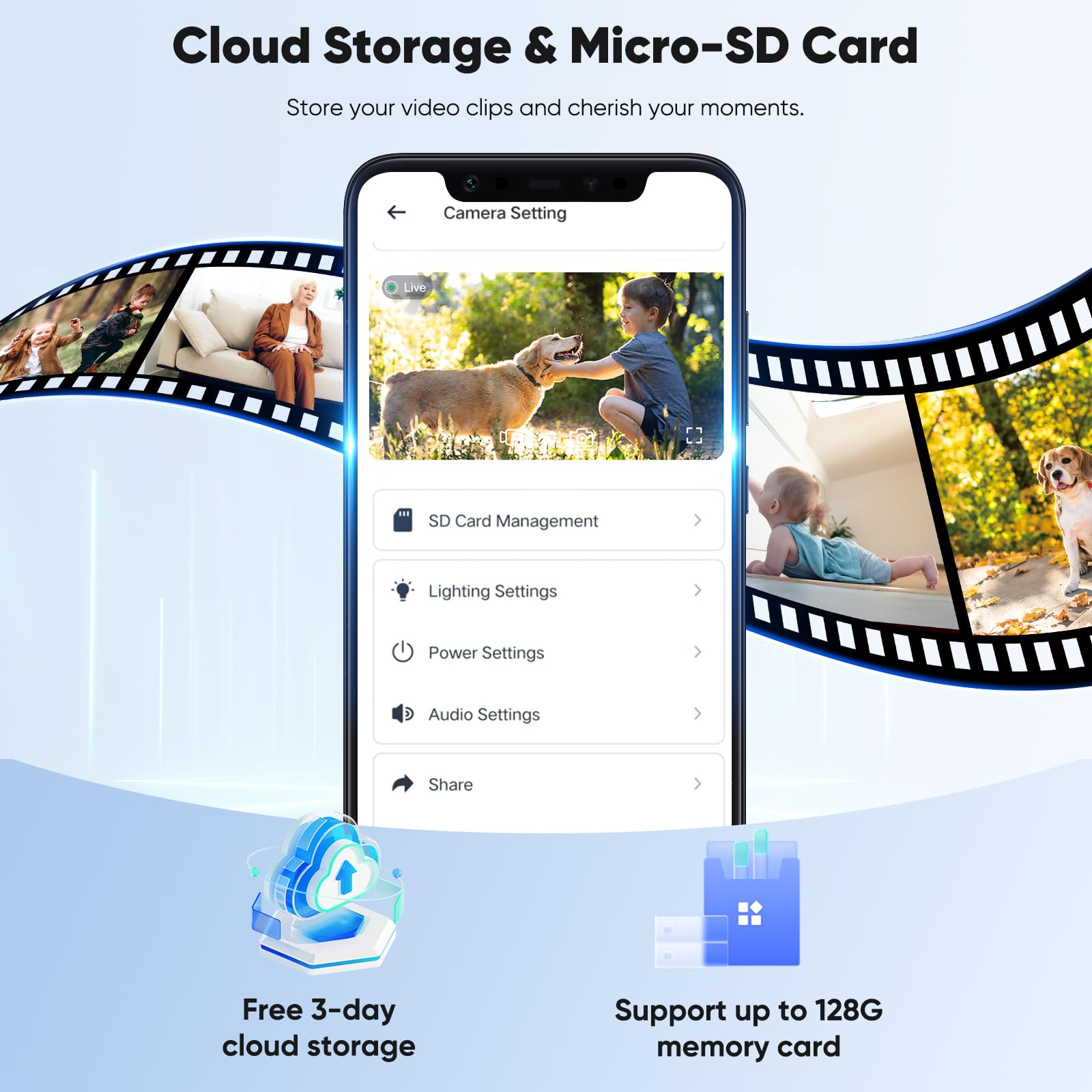 Free 3 Days of Cloud, SD Card Storage: The solar battery powered camera supports cloud storage and SD card storage. Cloud storage has 3 days of free cloud storage, so your surveillance videos can be easily saved and viewed at any time. The SD card (not included) supports up to 128GB. The SD card allows data to be saved locally, which can effectively prevent data loss caused by network interruption or service failure, and protect privacy and security.