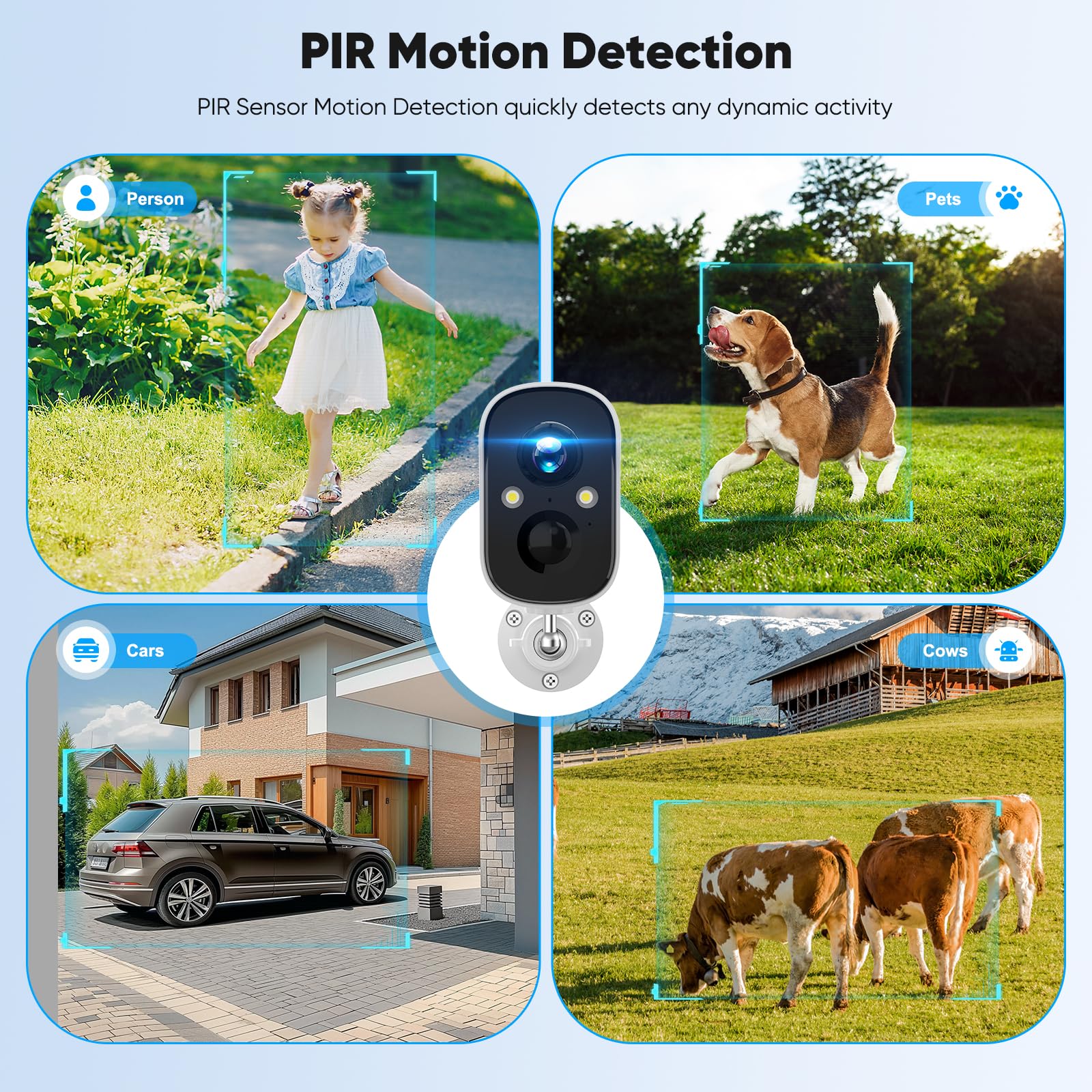 2K Full HD Color Night Vision: The security cameras wireless outdoor uses 2K Full HD resolution to provide clear and sharp images, ensuring you can see every detail in real time. It supports color night vision mode, which can use spotlight to fill in the light even in low-light environments, presenting motion images as clear color images, providing you with a more intuitive monitoring experience.