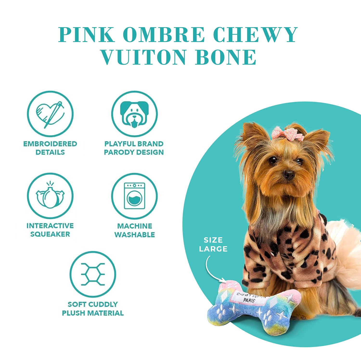 Funny Parody Plush Dog Toy: Let your furry fashionista fetch some fashion-forward fun with this Pink Ombre Chewy Vuiton Bone dog plush toy, featuring a stylish pink ombre with a white monogram pattern on the soft plush exterior, a built-in squeaker hidden inside, and a durable mesh lining for added strength, making it suitable for aggressive chewers; it’s a playful, cute squeaky dog toy that combines style and fun, measuring 9"x6”x1.5”