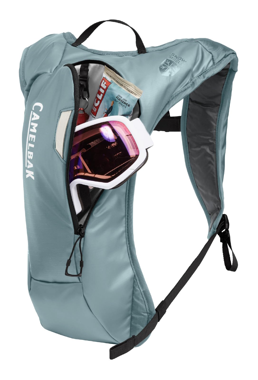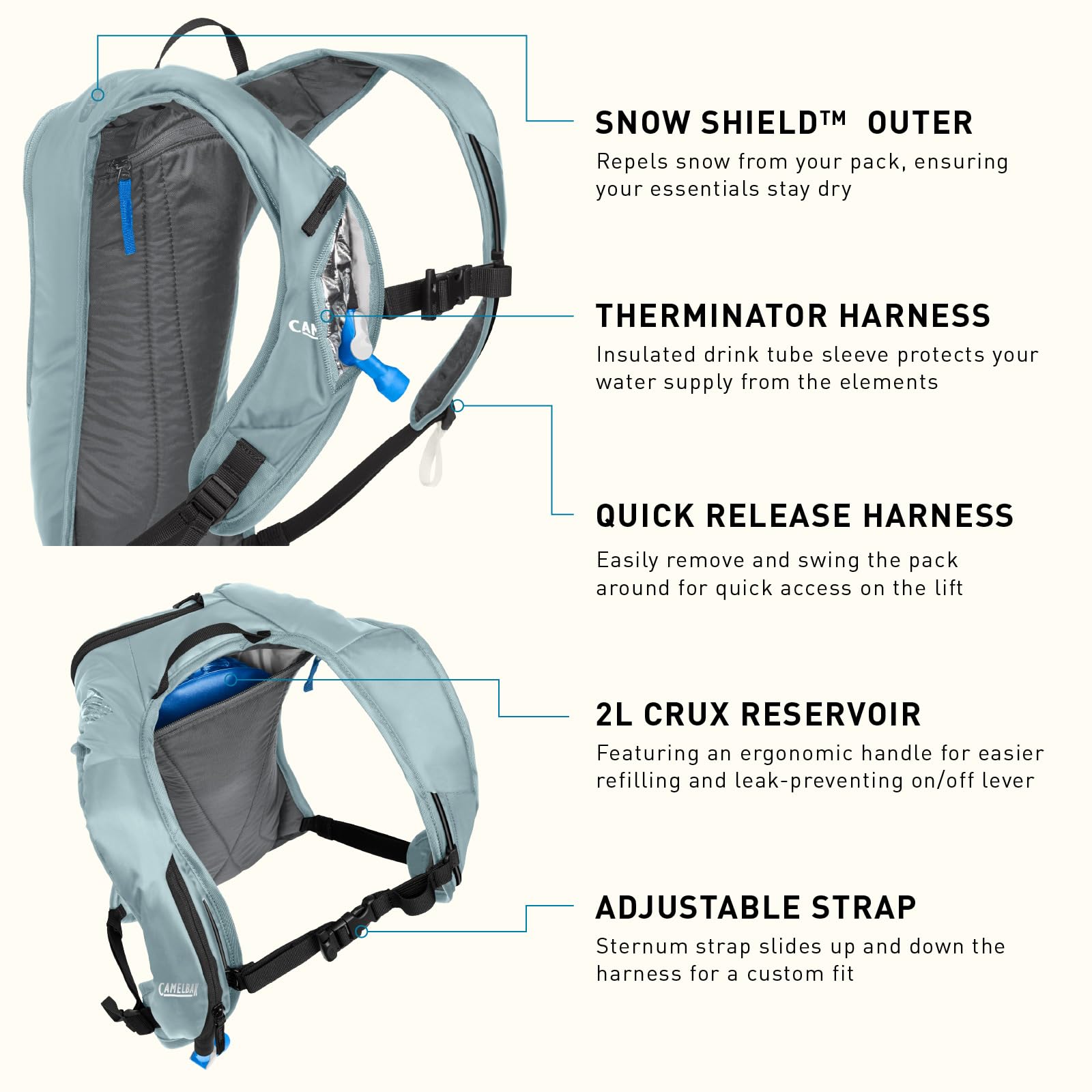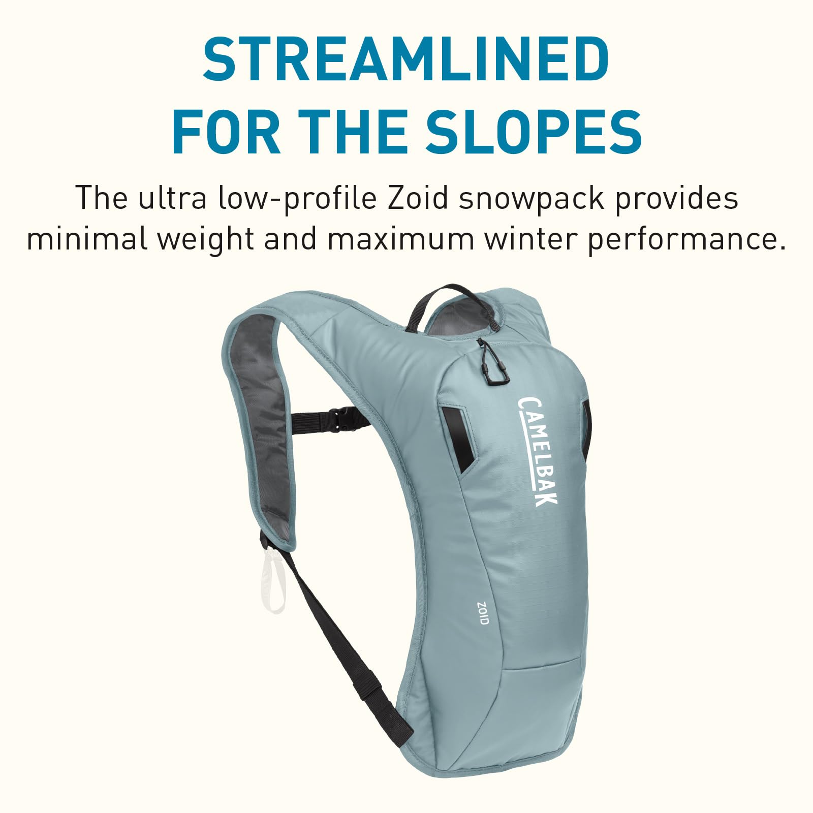 The CamelBak Zoid is the ultimate minimalist snow hydration pack, redesigned for lift-friendly performance and winter-ready durability. Featuring a 70oz Crux Reservoir with an ergonomic handle and on/off lever, the Zoid keeps hydration flowing with the Therminator Harness, which insulates the drinking tube to prevent freezing. Its ultra low-profile design fits comfortably under or over layers and is optimized for chairlift rides with the Lift Access QR Harness, allowing quick access to essentials. Built with Snow Shield materials to repel snow and moisture, the Zoid also includes a secure zippered pocket, adjustable sternum strap, and a slim silhouette that won’t get in the way of perfect powder laps.