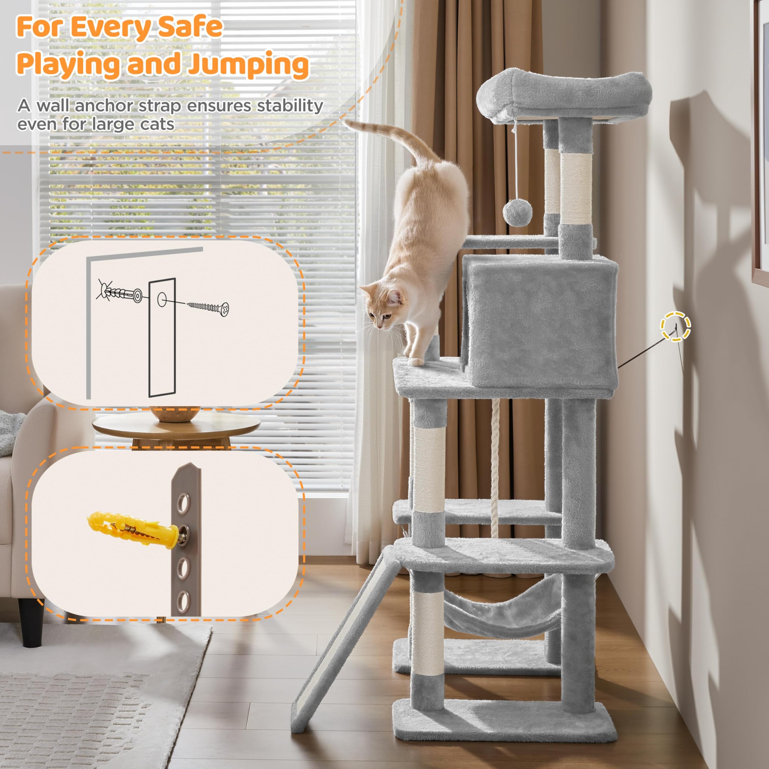 Engaging Multilevel Layout: This cat tree with natural sisal is thoughtfully designed with cozy condos, a lower hammock, and a high perch for scenic views. Scratching posts, a ladder, a hanging ball, and rope keep your cat entertained and active all day