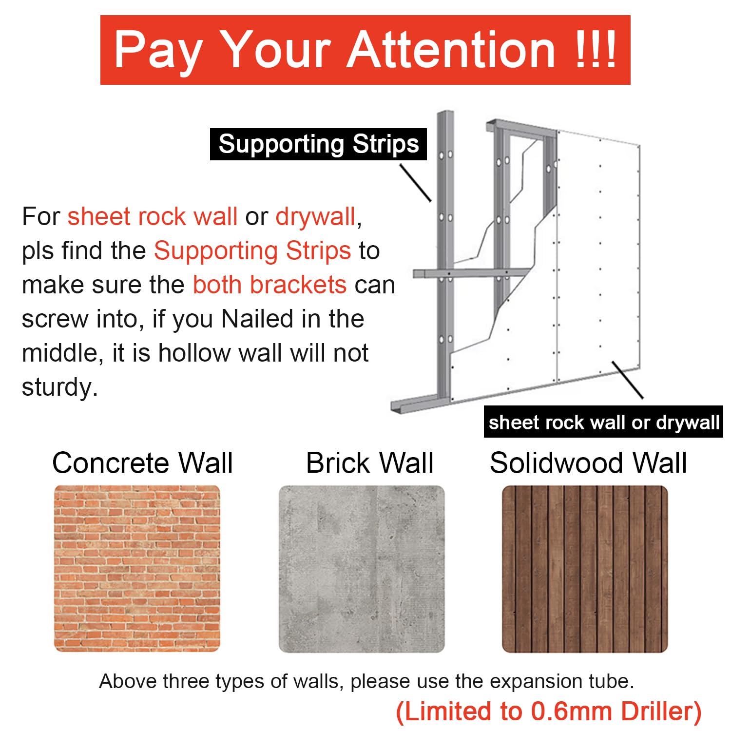 Pay Your attention: For sheet rock wall or drywall, pls find the Supporting Strips to make sure the both brackets can screw into, if you Nailed the fold down wall mount desk table for small spaces in the middle position, it is the hollow wall and will not sturdy.