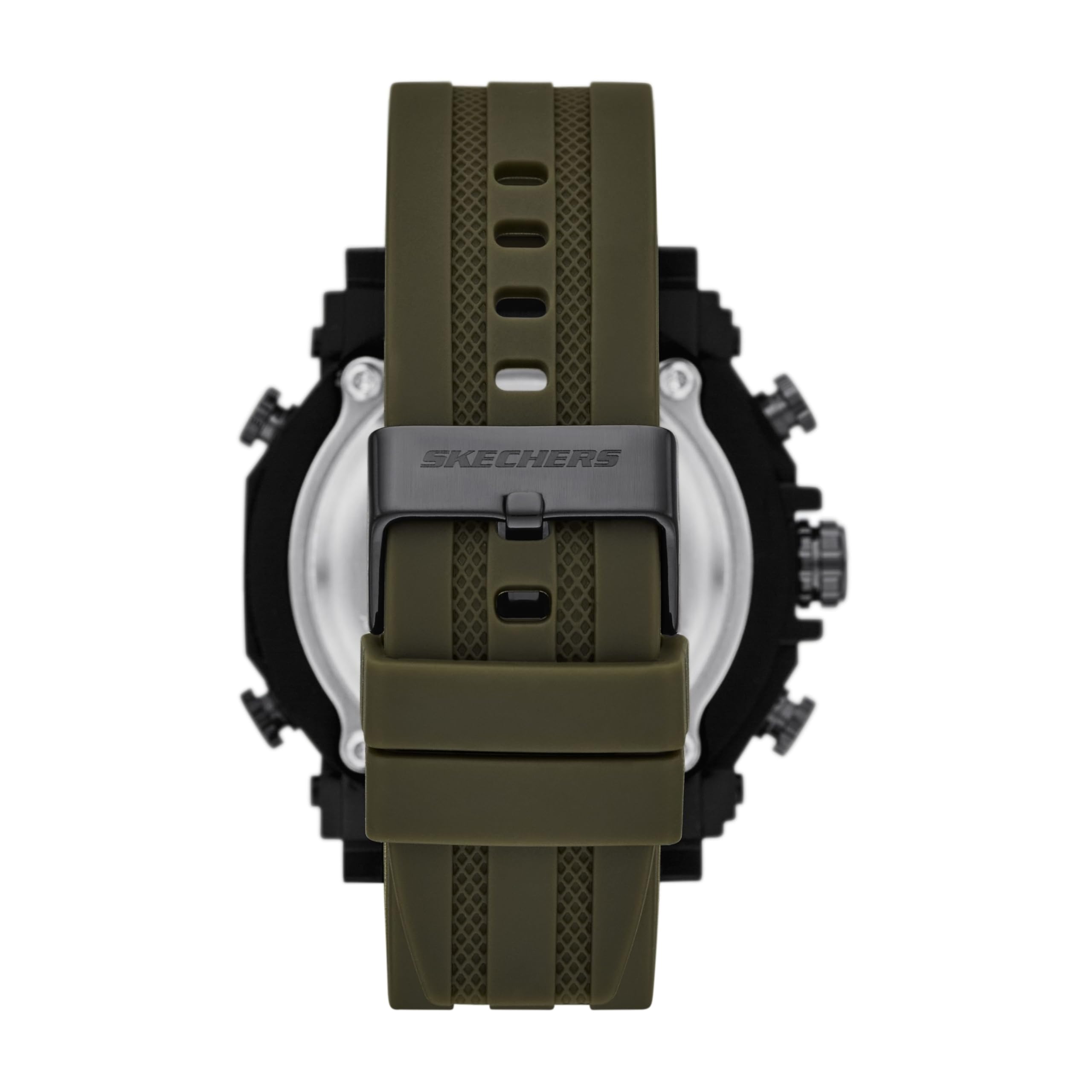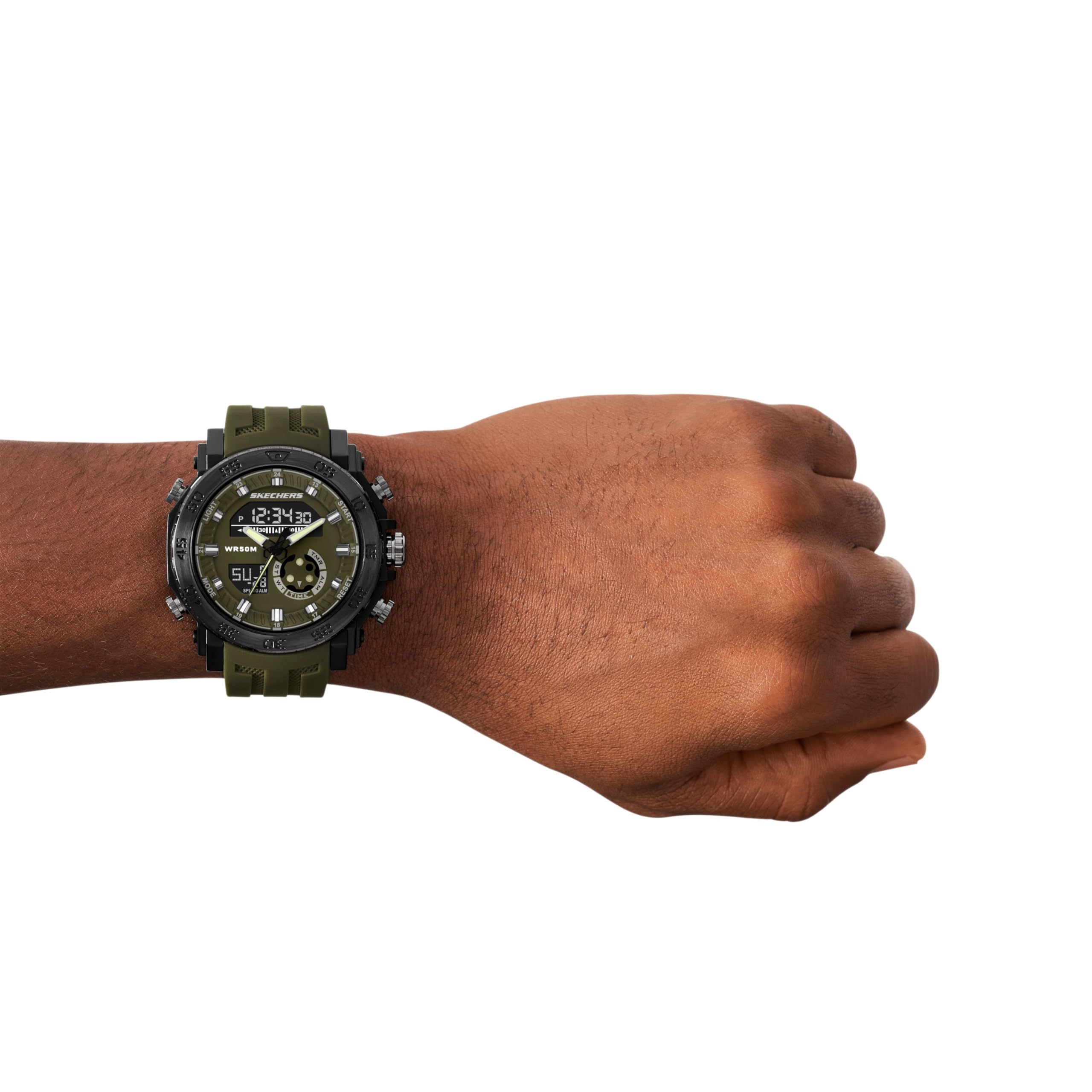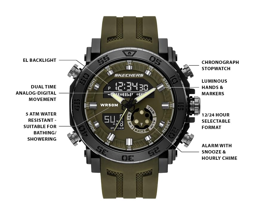 This Skechers Ridgeland Analog-Digital watch is the perfect mix of functionality and cool showcasing a heavy-duty black case, an olive green analog and digital face with a matching strap, and robust sporty details.