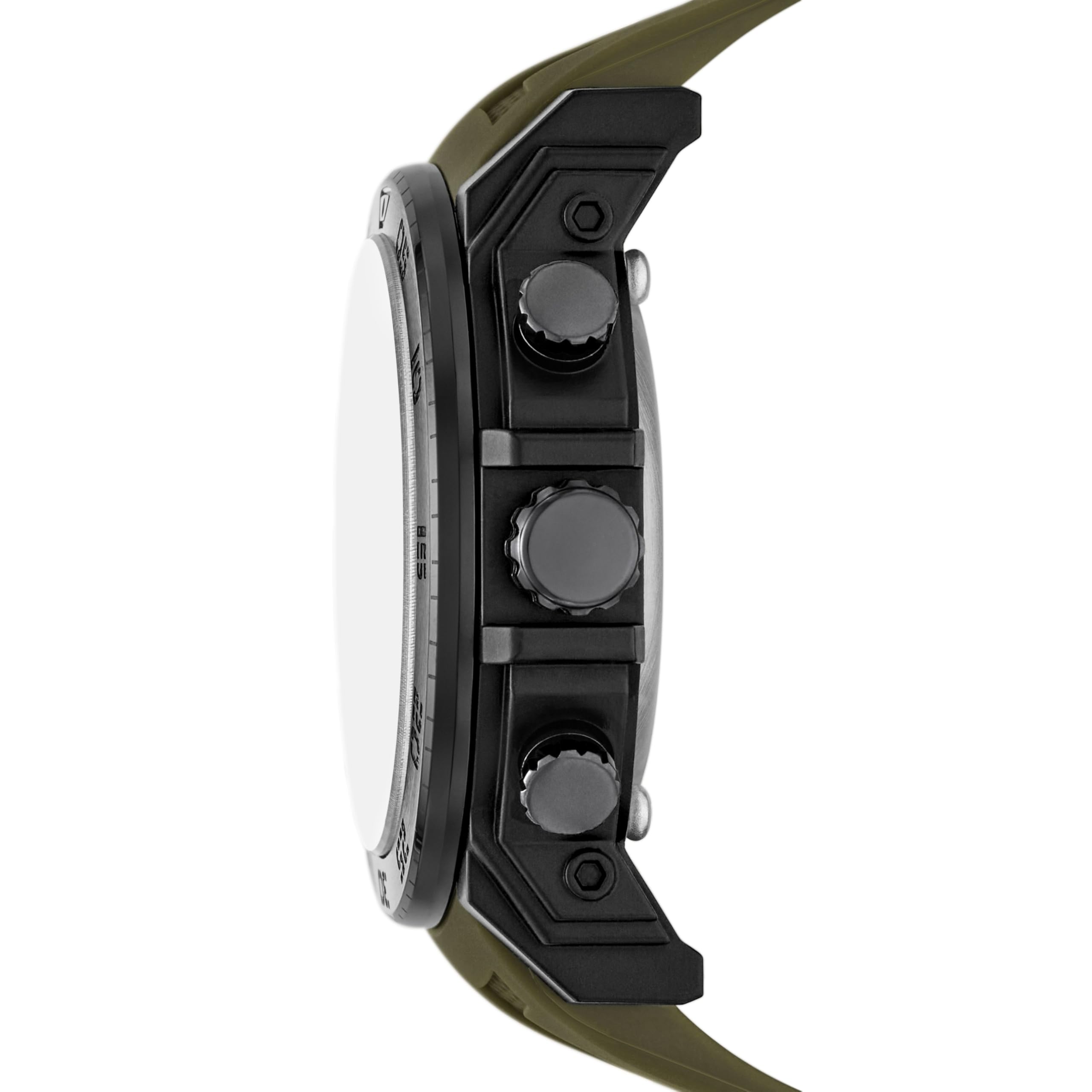 Round polycarbonate case, with a green dial.