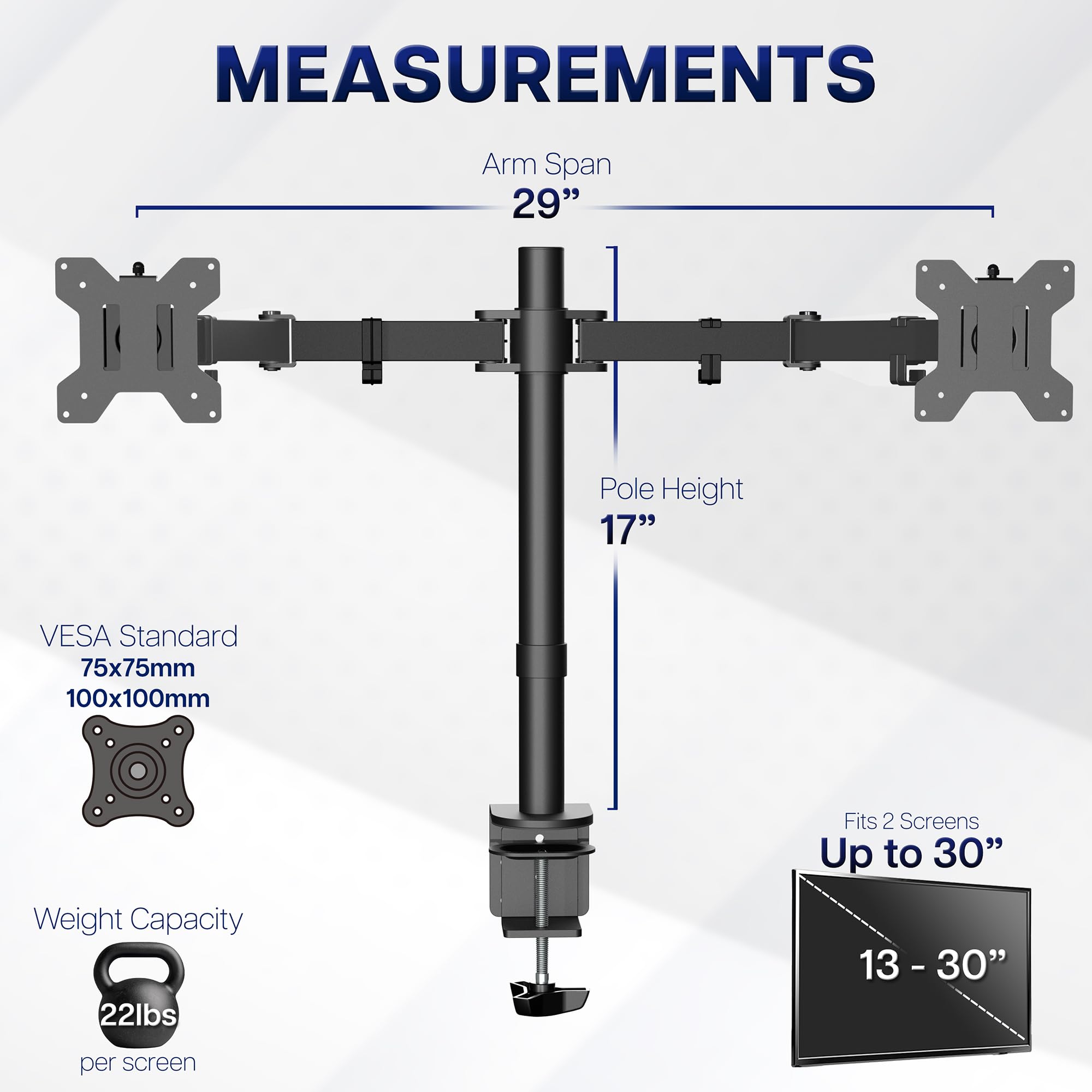 Fits 13" to 30" Screens - Dual monitor mount fitting two screens 13” to 30” in size and up to 22 lbs in weight each with VESA 75x75mm or 100x100mm backside mounting holes. Cable management clips are provided along the arms and center pole.