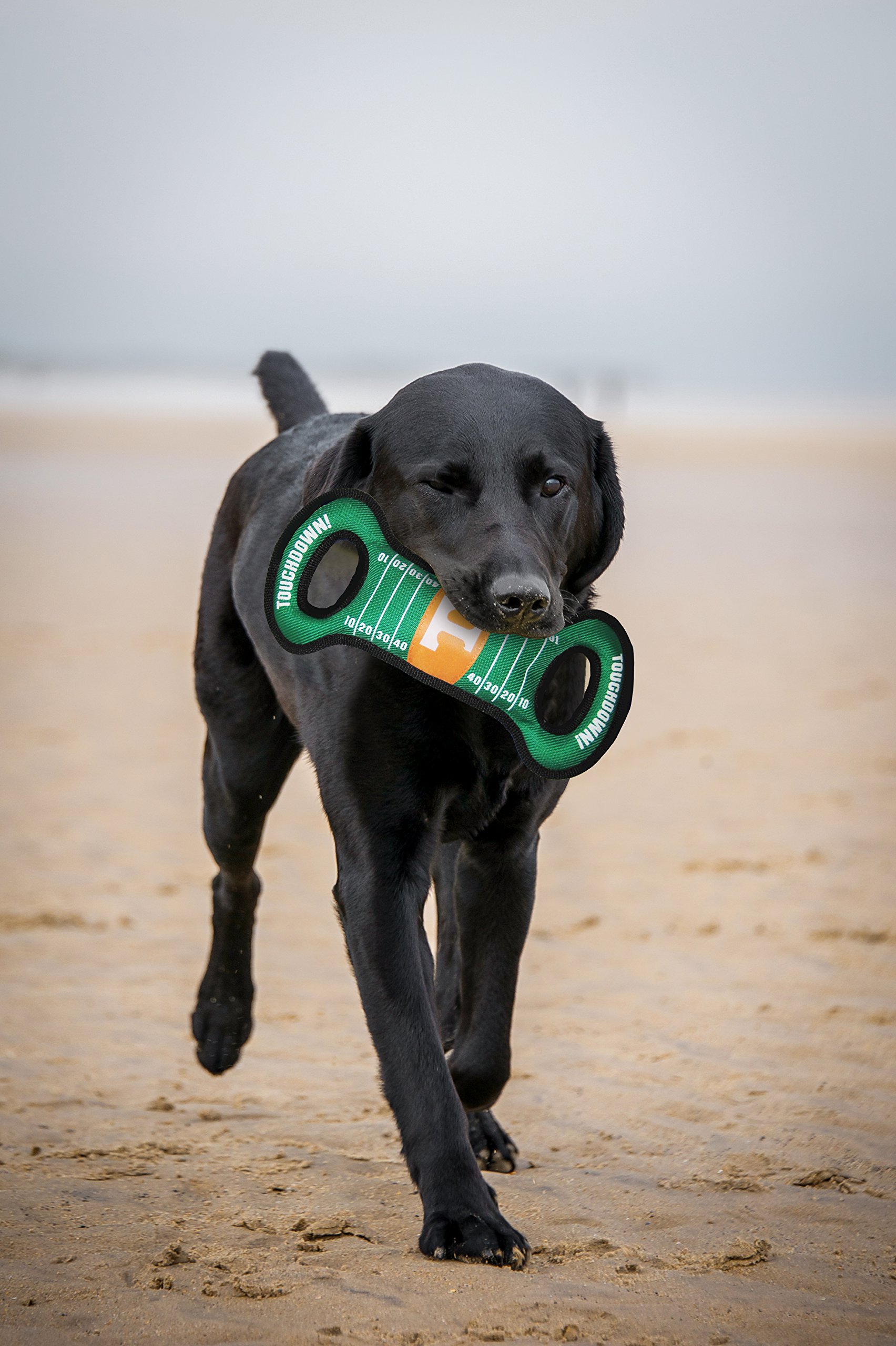 CONSTRUCTION - This unique dog toy is made from heavy duty and durable canvas outer held together with nylon web binding. Featuring a woven team logo and screened football field graphic. Touchdown!