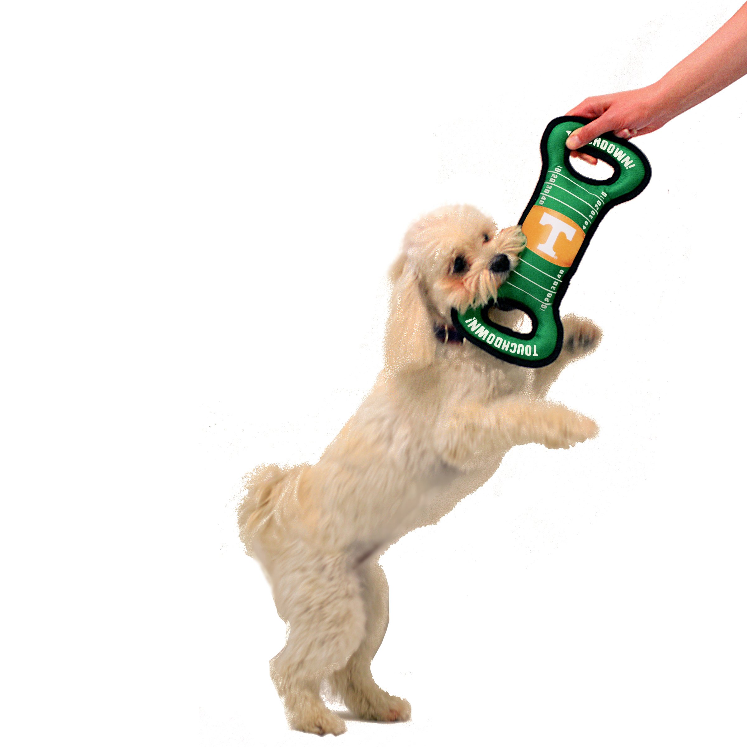 Show support for your favorite team while having fun with your sporty pup! This College Team Field pull toy is made out of heavy duty nylon with a tough web trim. Tuggable squeaker for dogs that love to play and squeak their dog toys. Great for strong chewers and provides hours of play and exercize! SIZING & USE: This NCAA Licensed dog toy is approximately 13 inches long and 6 inches wide.