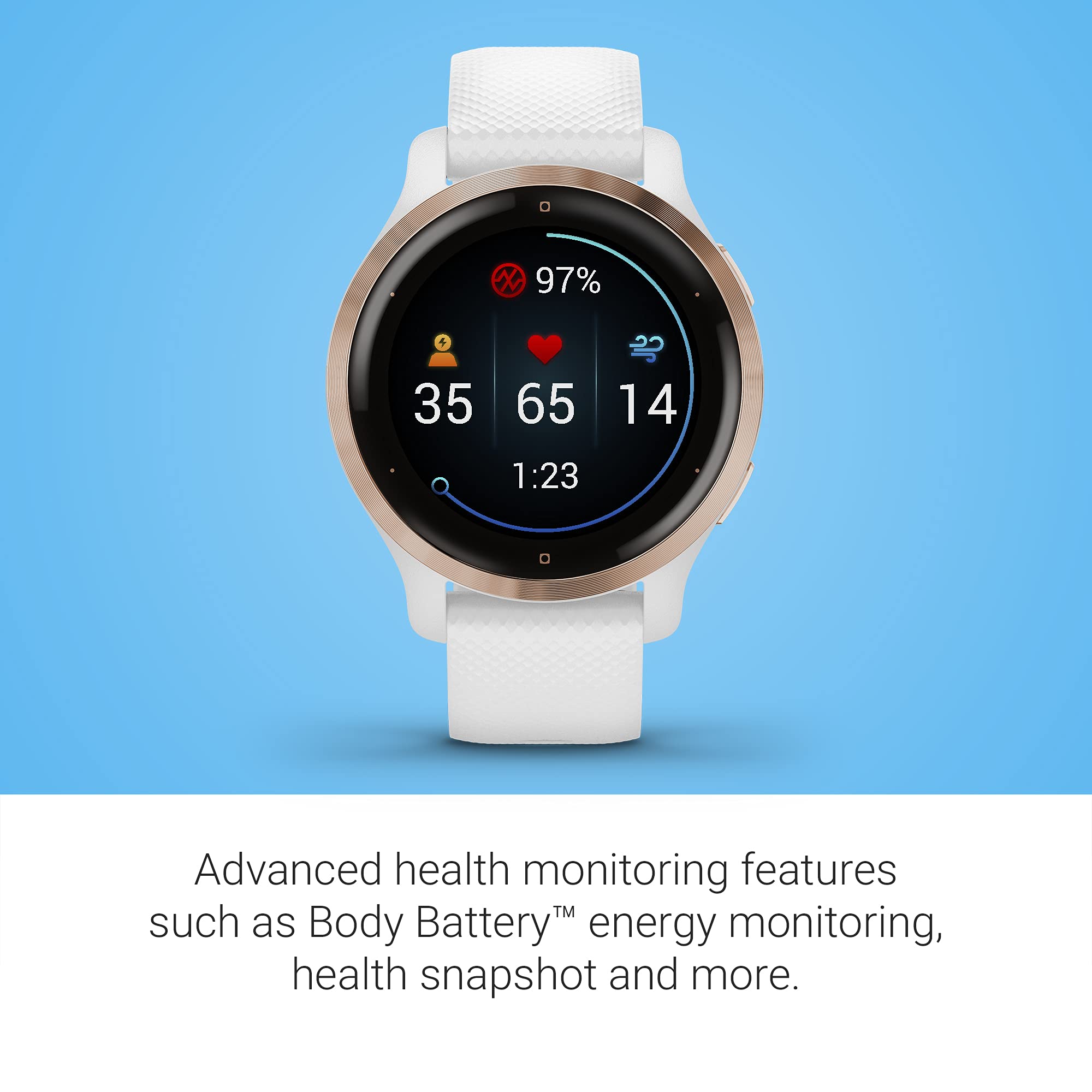 Know your body better with extensive health monitoring features including health snapshot, Body Battery energy levels, sleep score, fitness age, stress tracking and more (this device is intended to be an estimation of your activity and metrics; it is not a medical device)