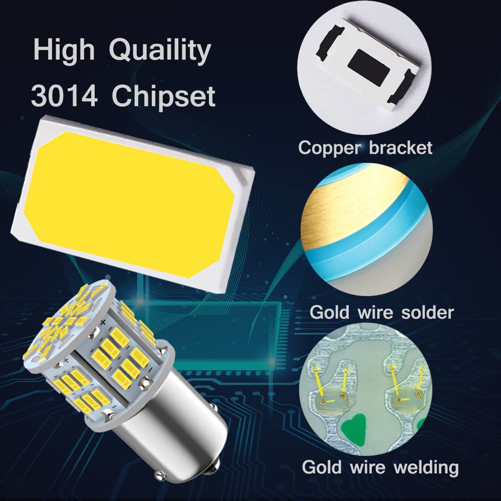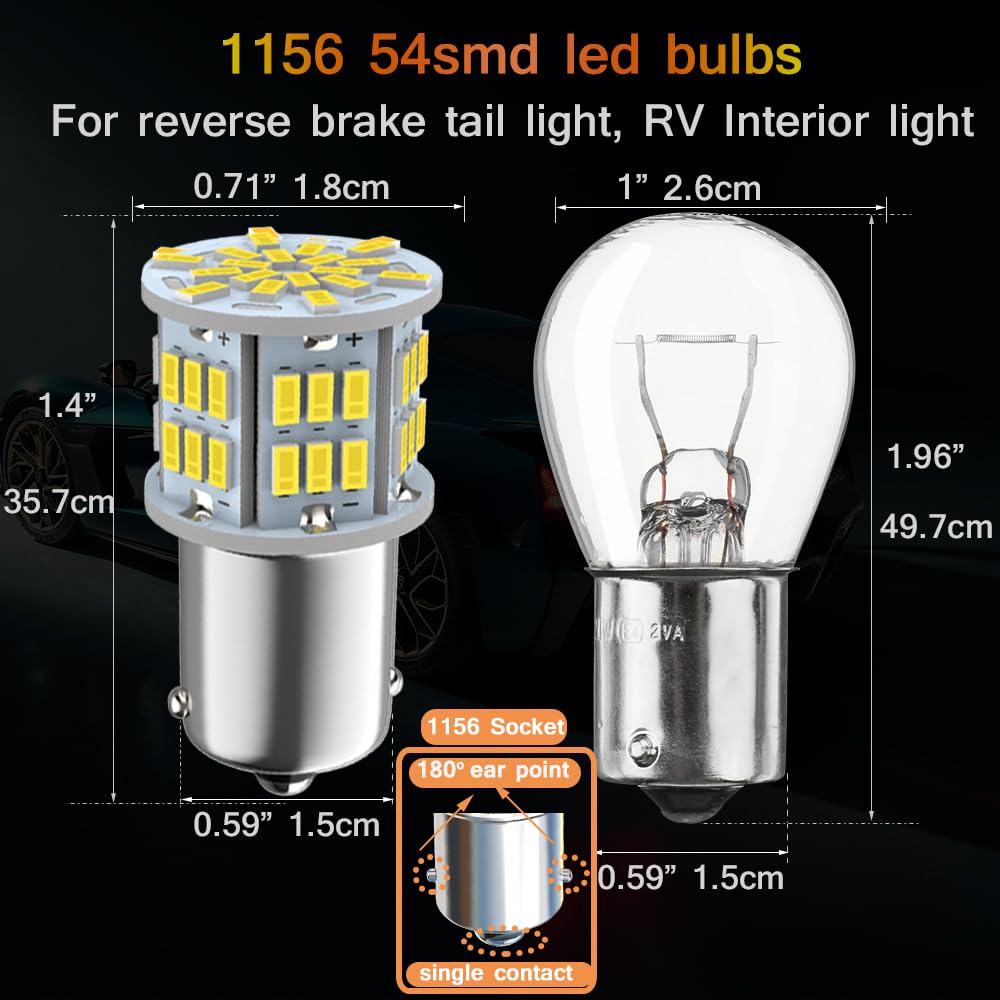 Specification: 2pcs 1156 bulb with 54smd 3014 led chips, Length:1.4” 35.8mm, Diameter: 0.71” 18.2mm , 6000K White light, 300lm per bulb, Voltage: 12-24V, Wattage: 3w.