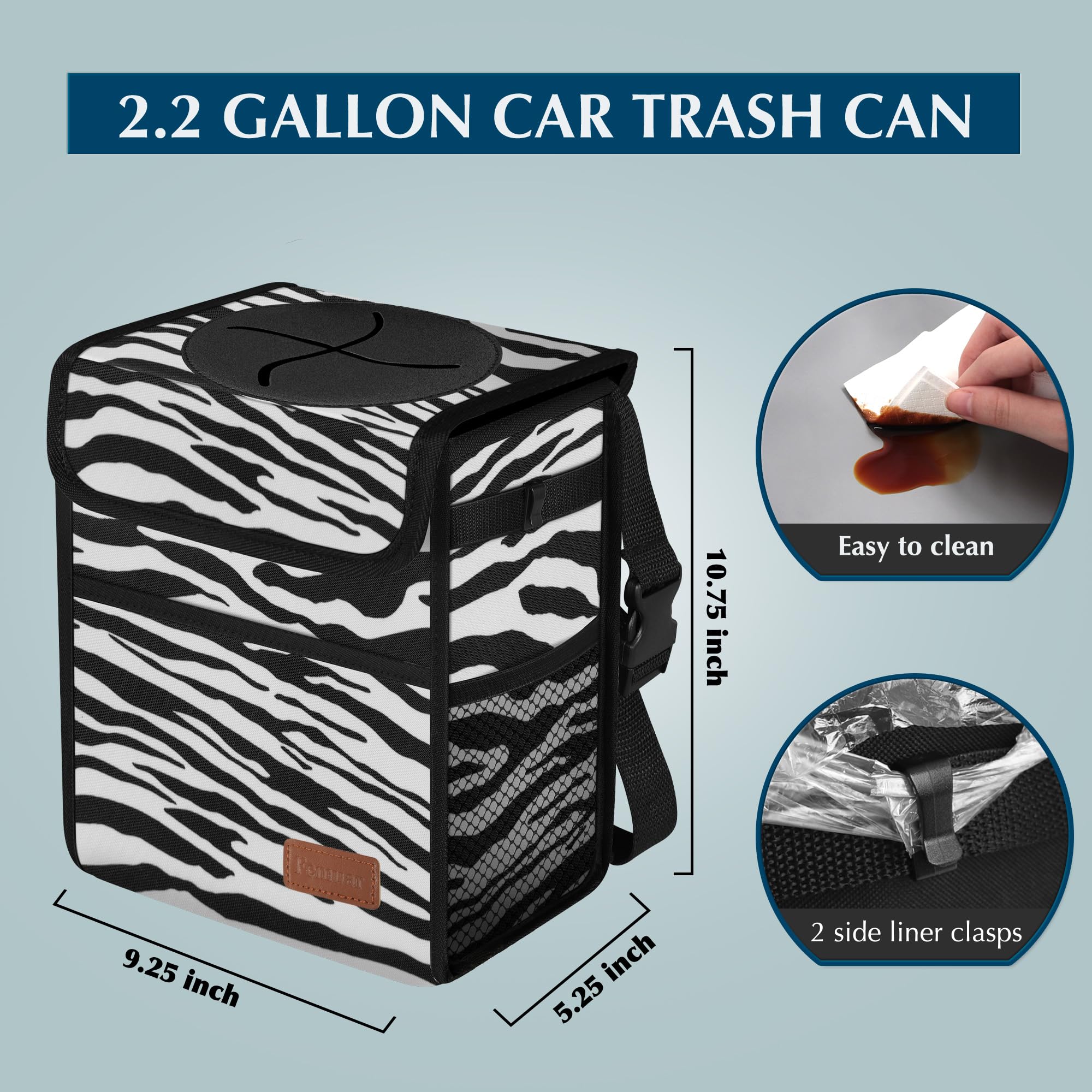【LARGE CAPACITY 】The size is 9.25*5.25*10.75 inches, our car trash can with a large compartment, two elastic mesh pockets on the side, and an open pocket at the front, which can hold 2.25 Gallon/8.5L capacity to save space, it can be folded up when not in use, very convenient.