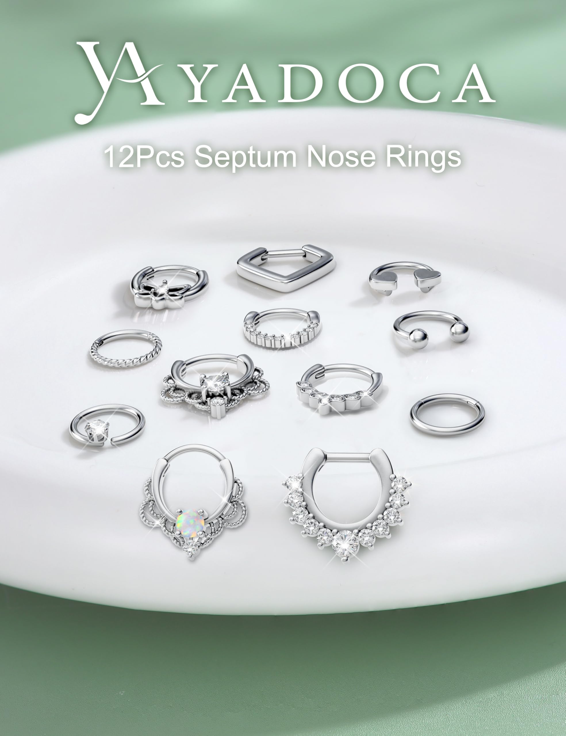 YADOCA 12pcs 16G Septum Rings for Women Men Hypoallergenic Surgical Steel Nose Piercings Jewelry Clicker Hinged Tragus Hoop Earrings CZ Love Nose Ring 8-10mm