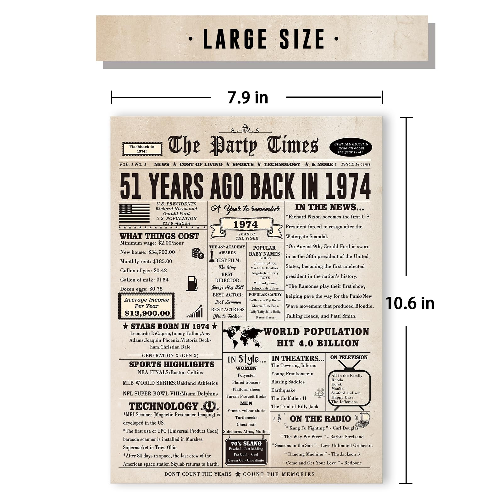 In a world where every year is a chapter in the story of life, It's more than just a card; it's a cherished keepsake and a testament to the joy of celebrating life's milestones! When it comes to celebrating a remarkable 51 years of life, 51st birthday card is the ultimate tribute to a journey well-lived. Whether you're celebrating your best friend, parents, siblings, or spouse, this card is the perfect gift that encapsulates a lifetime of memories. Perfect option to recognize a milestone birthday. Size is large enough to easily read all the interesting fun facts. Plenty of room inside to personalize, well wishes/messages. Great option when you want a little more than a typical birthday card. Funny card with lots of good facts about the year you choose eg: median house prices, incomes, gasoline, historical events, movies, ect many of the events depicted on the card. The size was great to pass around for all to read, and made it handy to insert my own text.
