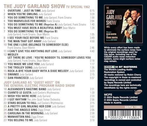 Taped for TV in 1962 "The Judy Garland Show" with Judy & guests Frank Sinatra & Dean Martin have been remastered from the original playback discs.