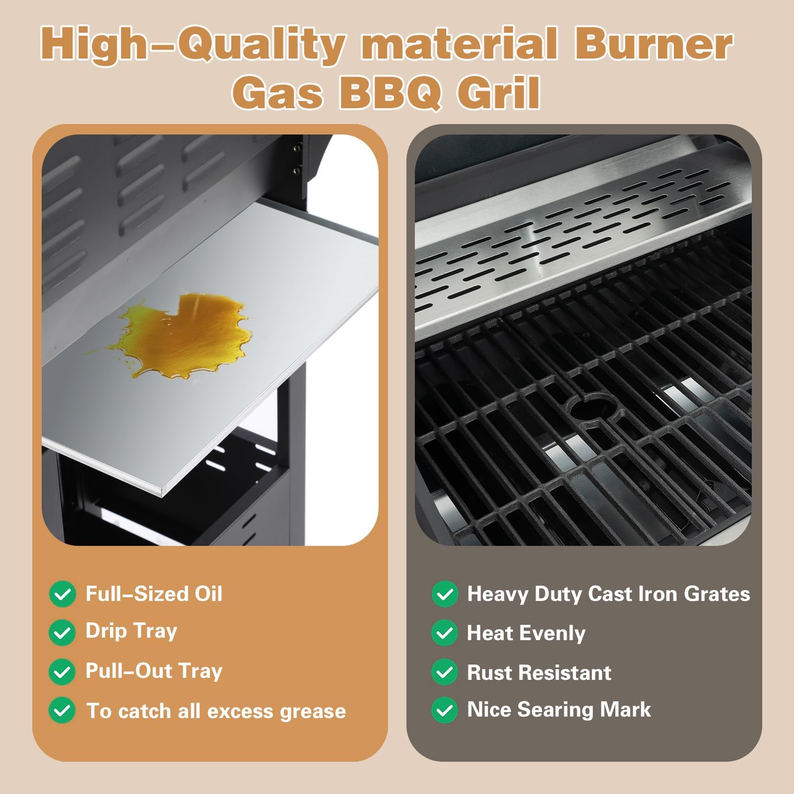 【VERSATILE USAGE】:Our propane gas grill works with standard 20 lb LP tanks (not included), with dimensions of 28.1W x 42.9 weight of 72 lbs. Family barbecues, outdoor parties, or camping trips etc. are perfect for it. Easy transportation of your grill wherever you need it is made by our 4 galvanized casters.