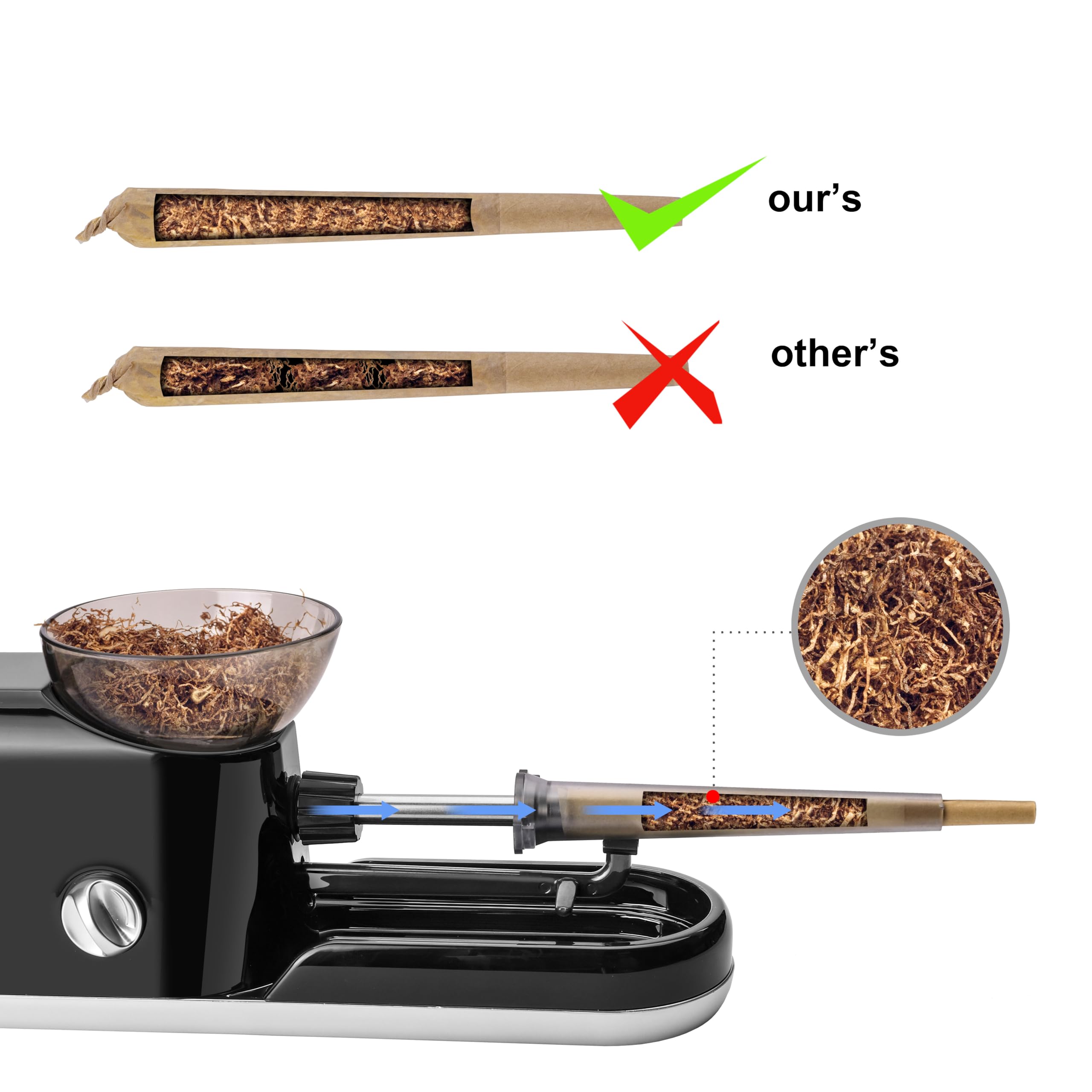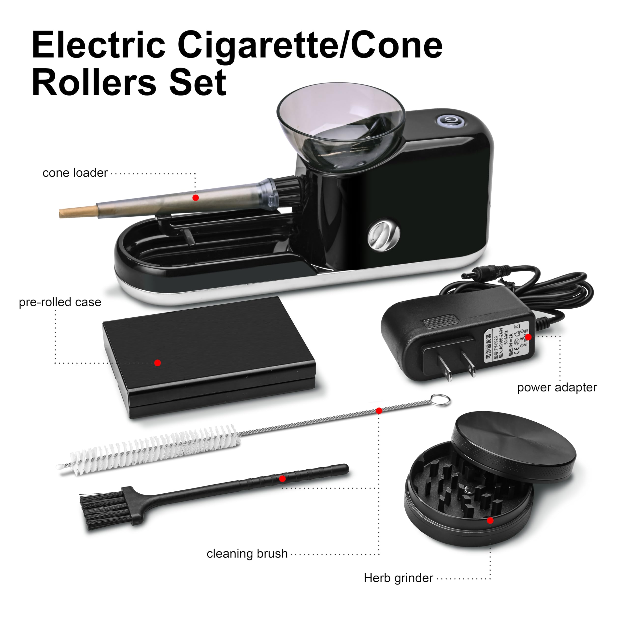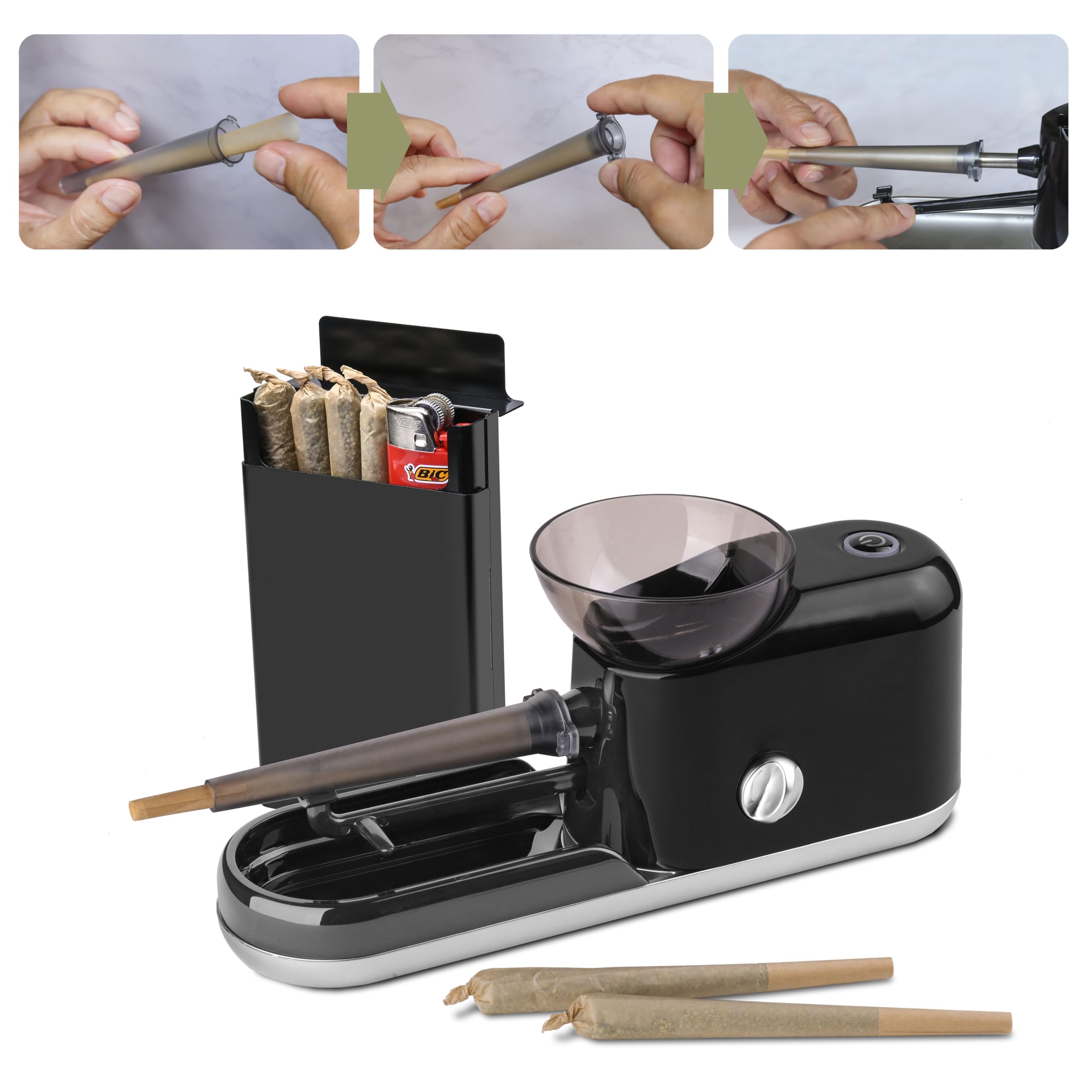 Easy to use:This Electric cone rolling machine has a knob and four adjustable levels of tightness, so users can adjust the tightness of the cone according to their actual needs, very easy to set.This Electric cone roller with pre-rolled case and grinder.machine are equipped with 6 non-slip pads to ensure comfort and stability of use.