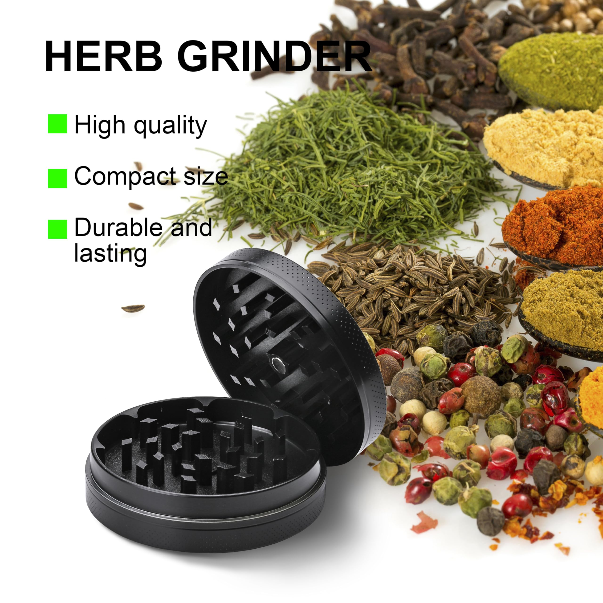 The Manual Grinder:This 2 inch manual grinder offers the perfect grind for leaves without any hassles.made of durable zinc with 23 extra sharp teeth that will grind your spices with ease. Perfect for your small grinder needs!