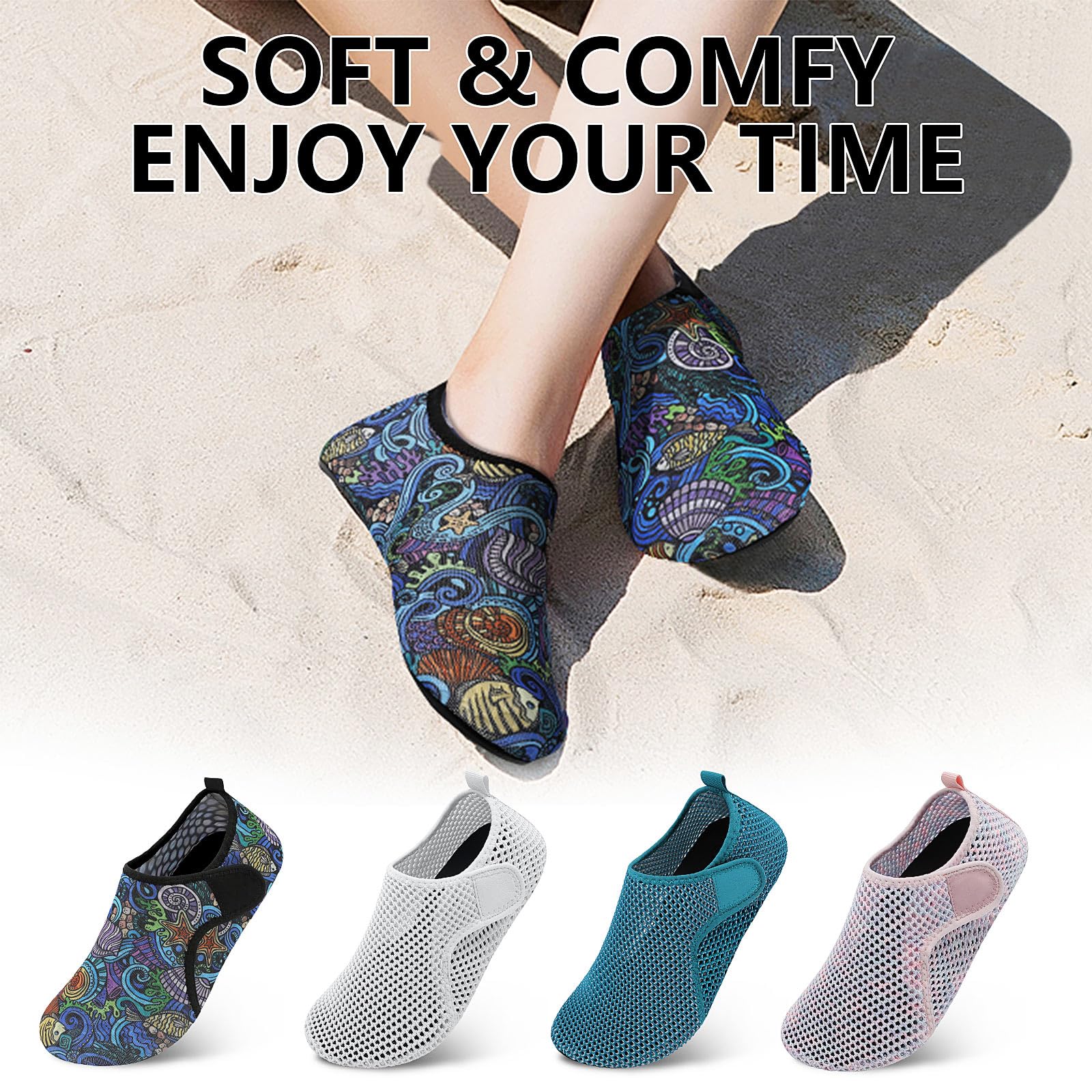 〓 Soft Flexible Beach Shoes »» The soft flexible rubber sole with 3D non-slip treads provides excellent grip even in slippery conditions. The zero-drop non-elevated sole offers better ground feedback, enhancing your enjoyment for walking over rocks, sand, tree branches, gravel trails, etc