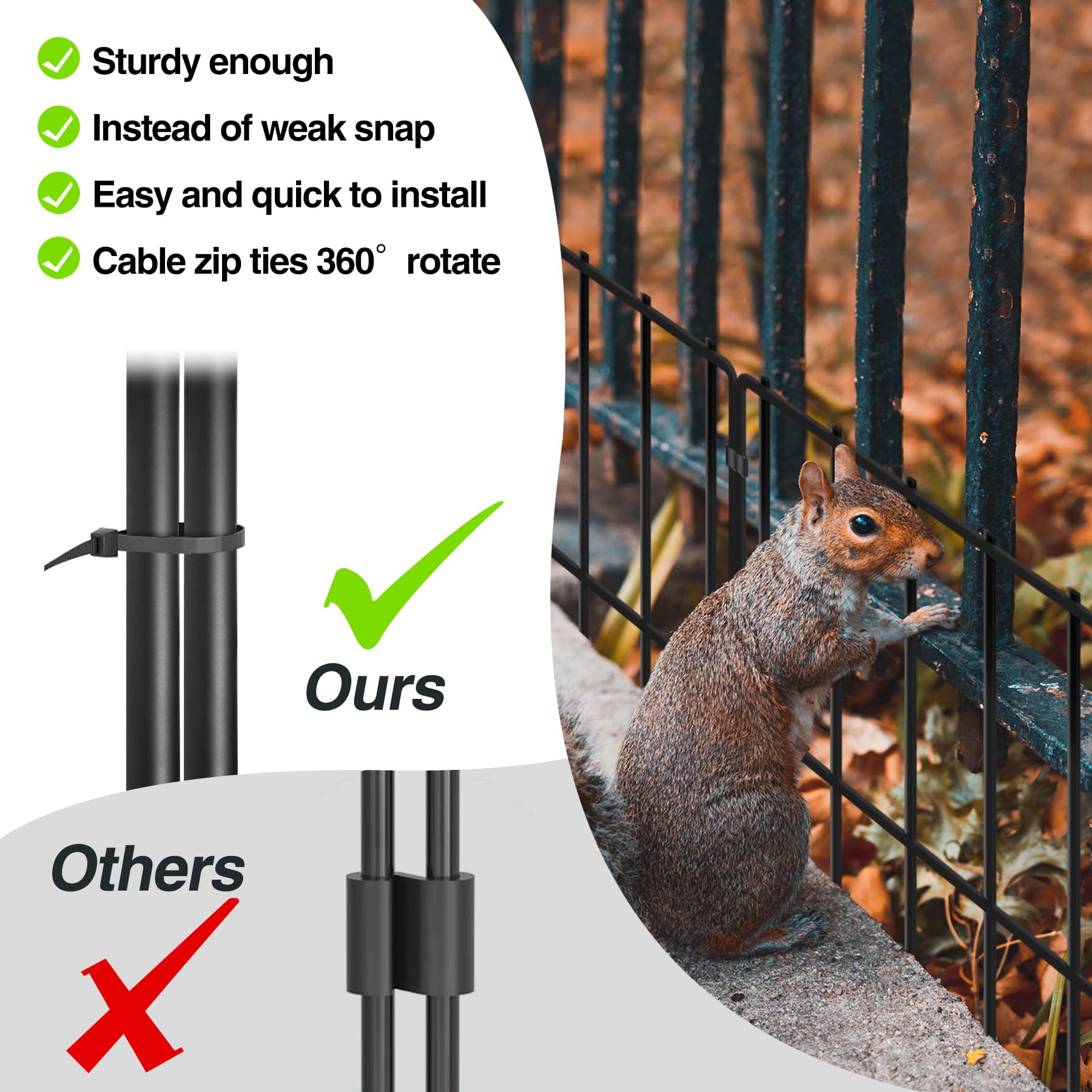 EXISTING FENCE GAP FILLER: Upgraded garden fence gap is reduced to 1.2 inches, extending the protection of your fence to the ground, can more effectively prevent pets from breaking free from the gap to escape, prevent other small animals from entering and damaging your garden and yard, and causing damage to your yard.