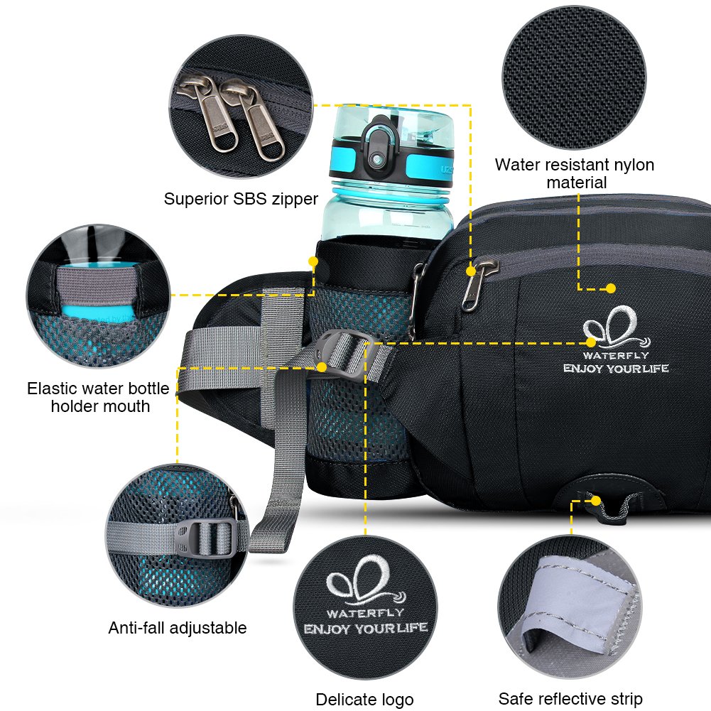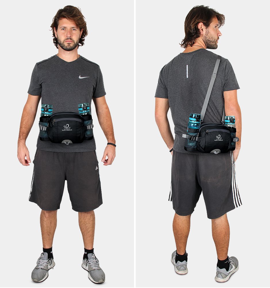2 Water Bottle Holders: (Bottles are not included) There is a fixed rope on the water bottle holder mouth, which efficiently keeps your bottle with diameter under 2.7" stable and safe while running or jogging, they can hold umbrella as well