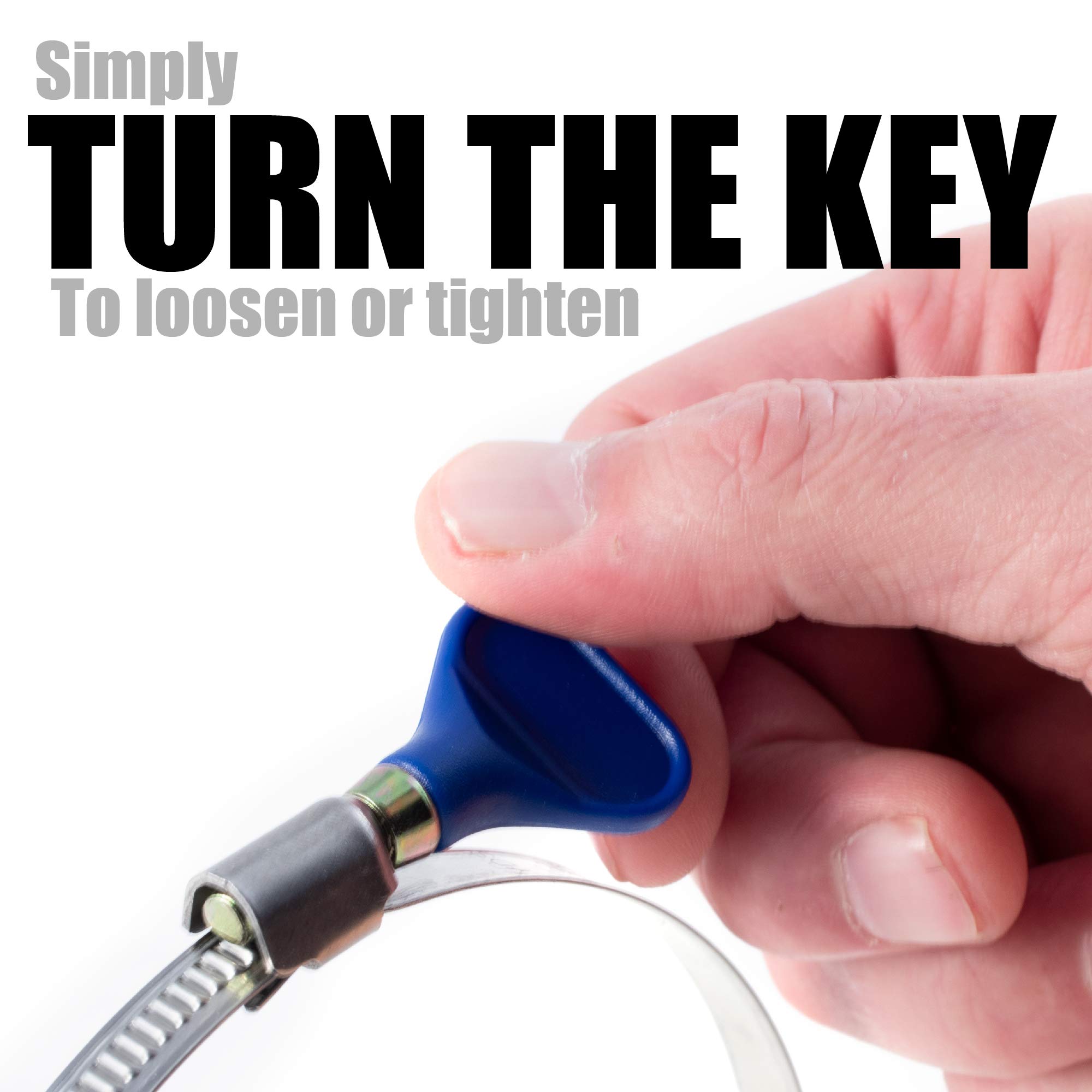 LARGE EASY TO TURN KEY - The easy to turn and easy to see blue key is made from a strong and durable polymer. The key is designed to make the securing and un-securing of hose much easier on the knuckles. No more knuckle busting flat head screw drivers or tiny socket wrenches. Simply to turn the key clockwise to tighten, counter clockwise to loosen.