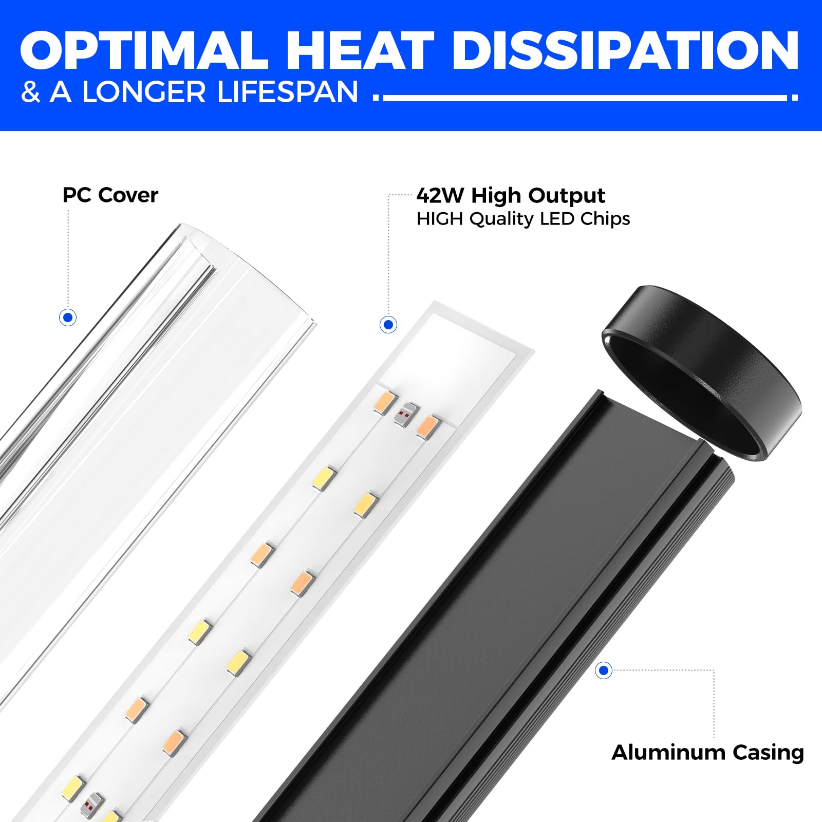 High-output and Effective Spectrum: The full spectrum grow light with a high output of 42 watts and up to 169 LEDs. Moreover, it is equipped with 660nm red wavelength chips to satisfy your plants' needs at different stages.With a CRI of 88, this grow light accurately shows colors, aiding in plant health monitoring and growth