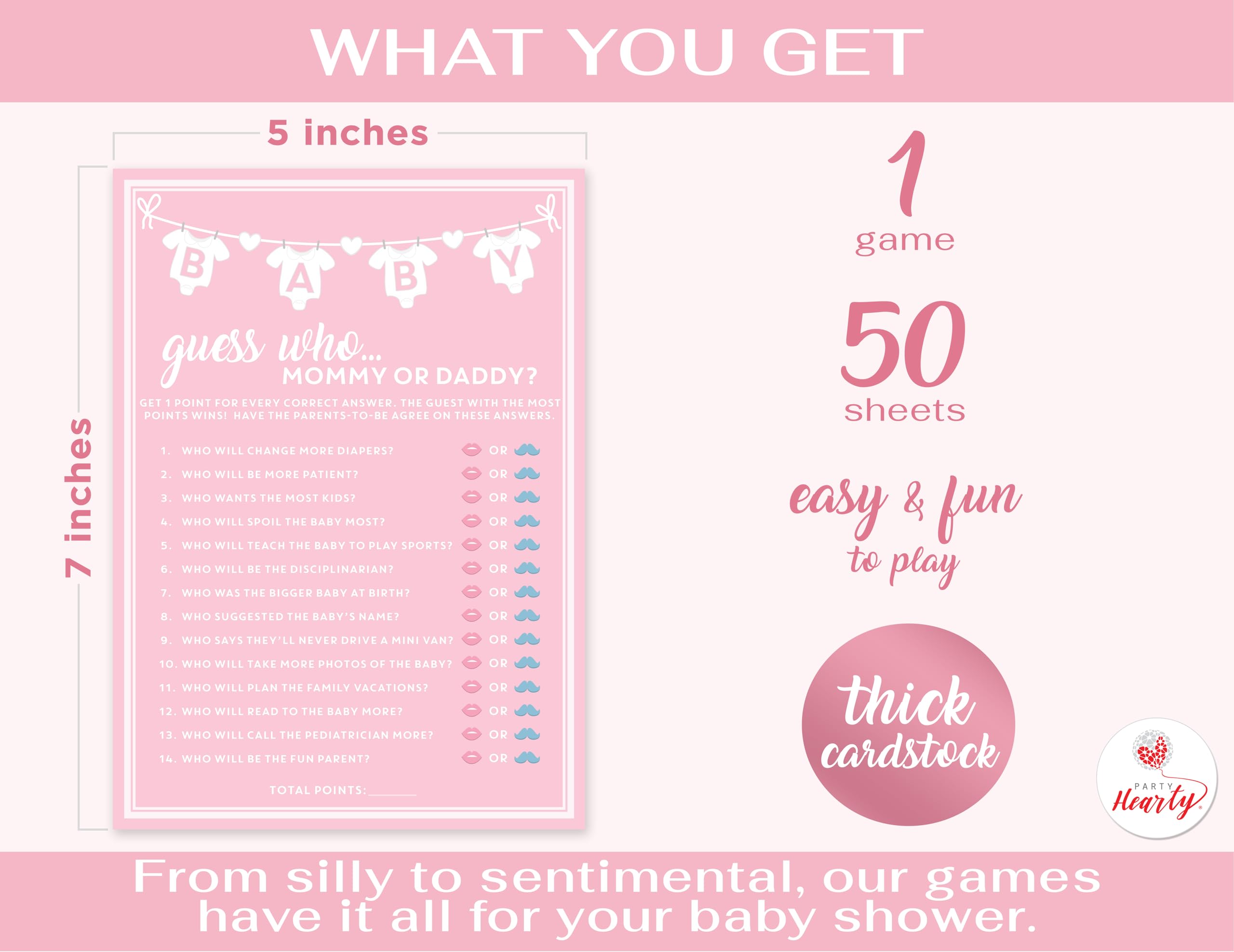 BABY SHOWER GAME EXTRAVAGANZA Includes 50 cards of Guess Who Mommy or Daddy; Professionally printed on thick matte premium offset papers, sturdy & easy to write on; It measures perfectly at 5x7 inch
