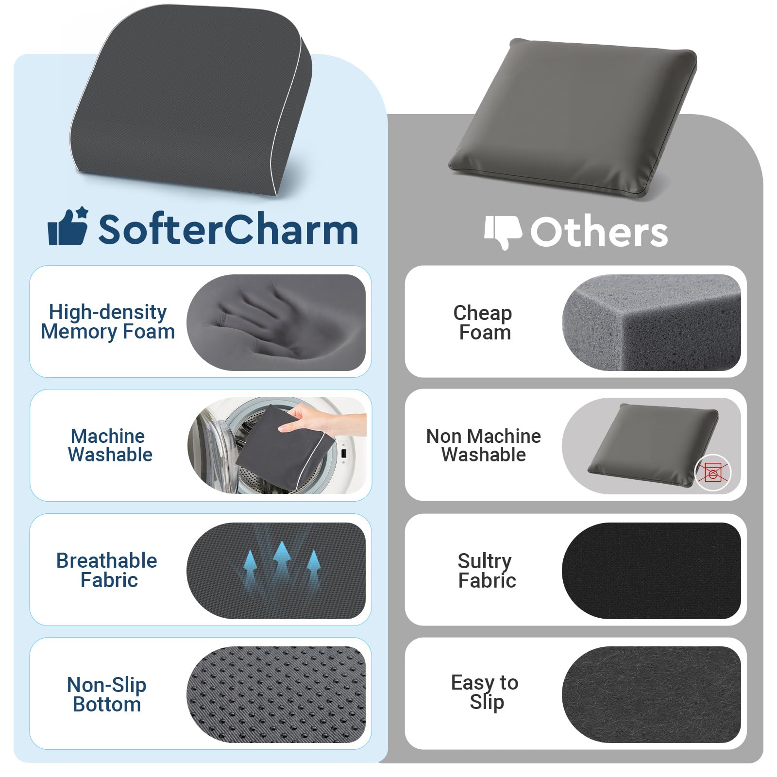 【Premium Certified Memory Foam】SofterCharm seat cushions are crafted from high-quality memory foam, certified for safety and purity. High-density memory foam will quickly rebound to its original shape after use