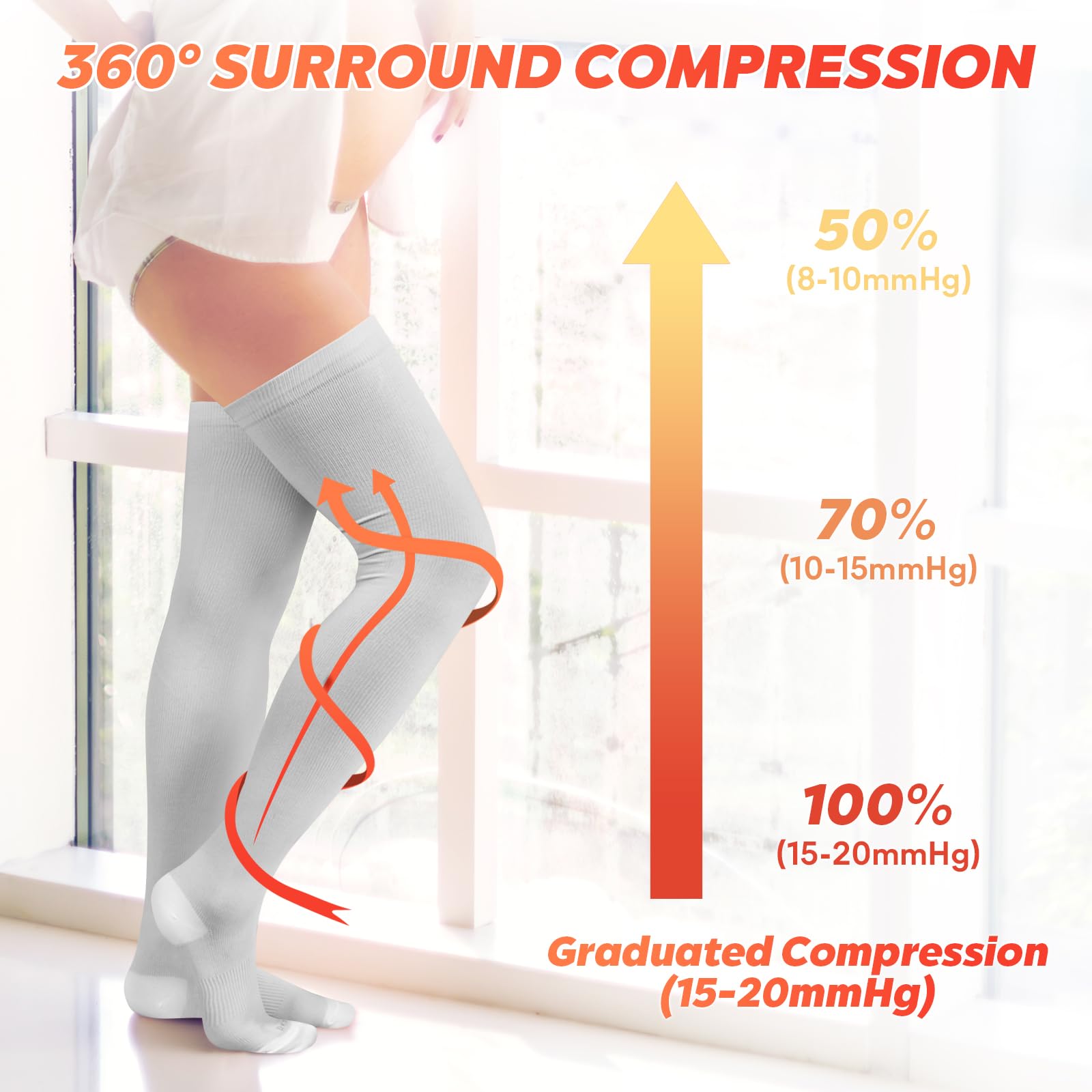 Exceptional Comfort: Made from 77% nylon and 23% spandex, these thigh high compression socks offer excellent elasticity and stretch. They provide precise gradient compression of 15-20 mmHg from the toes to the thighs, making them perfect for preventing leg fatigue, swelling, and aiding muscle recovery