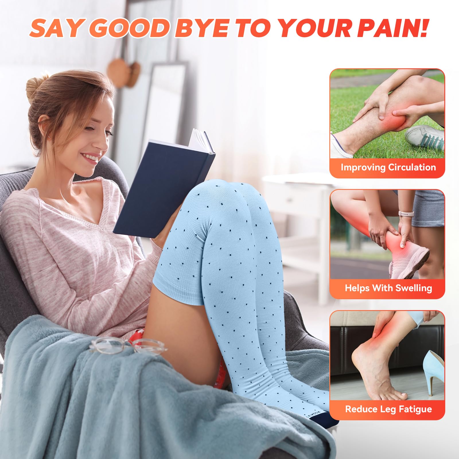 Stay in Place: The double-layered, thick cuff design ensures the compression socks stay securely in place, providing reliable support without slipping down your legs. The fitted, lightweight fabric offers superior comfort, breathability, and moisture-wicking properties, allowing you to enjoy comfort all day long