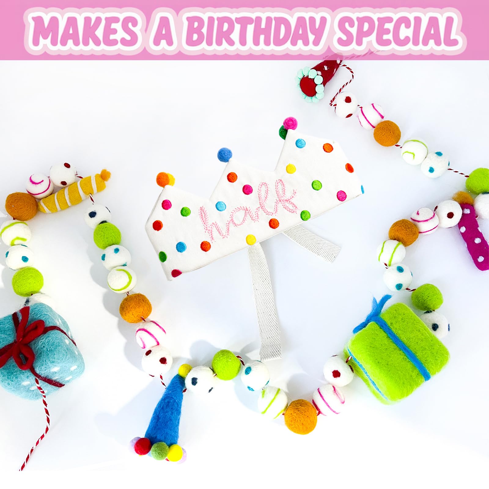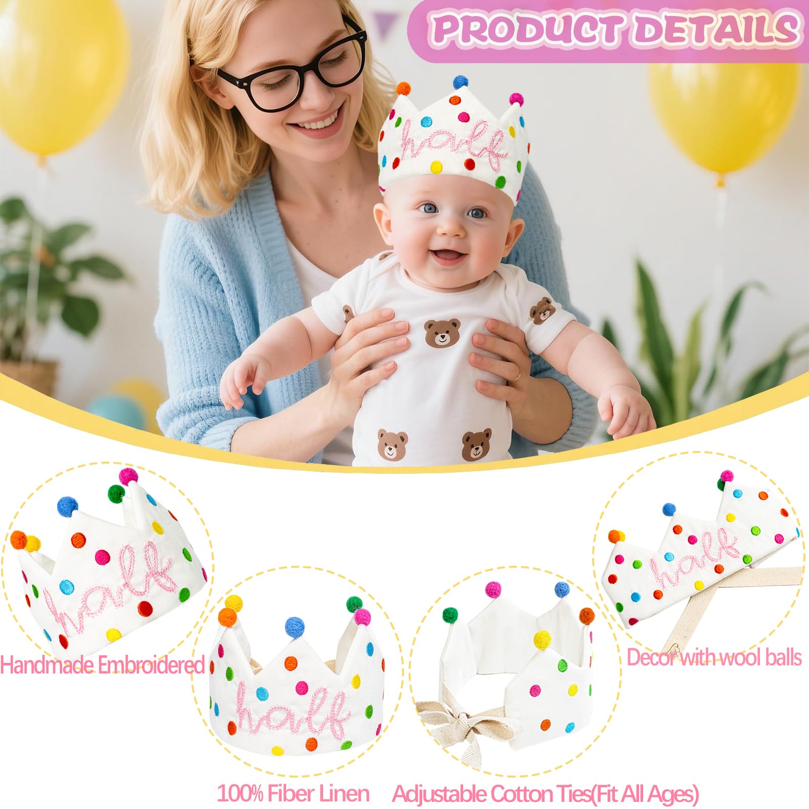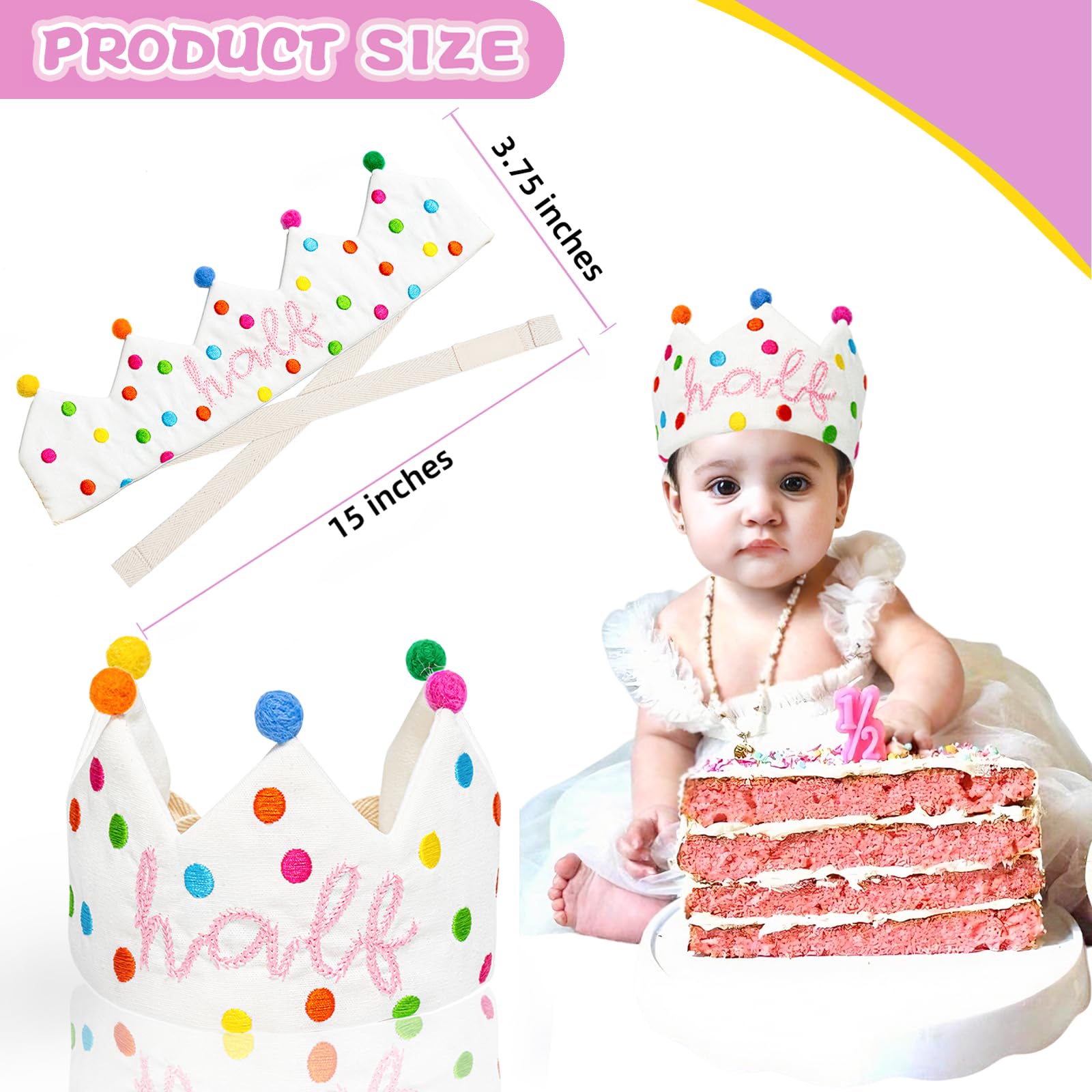 【Unique Design- Half Birthday Crown Hat for Girls Boys】- Our half birthday crown hat , featuring a pattern of Confetti Dots and hand-embroidered “Half” in a sweet cursive font, looks shiny and super well-made. We also decorate it with wool felt balls to make it more exquisite. This birthday crown will bring the party vibe and help create amazing photos and memories for your kids on special day. It’s a great party favor idea! Perfect for kids halfway milestone celebration party decorations.