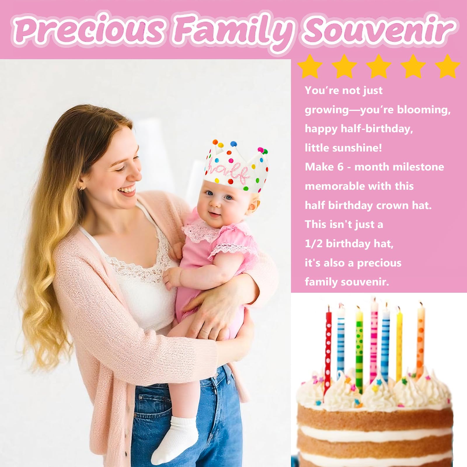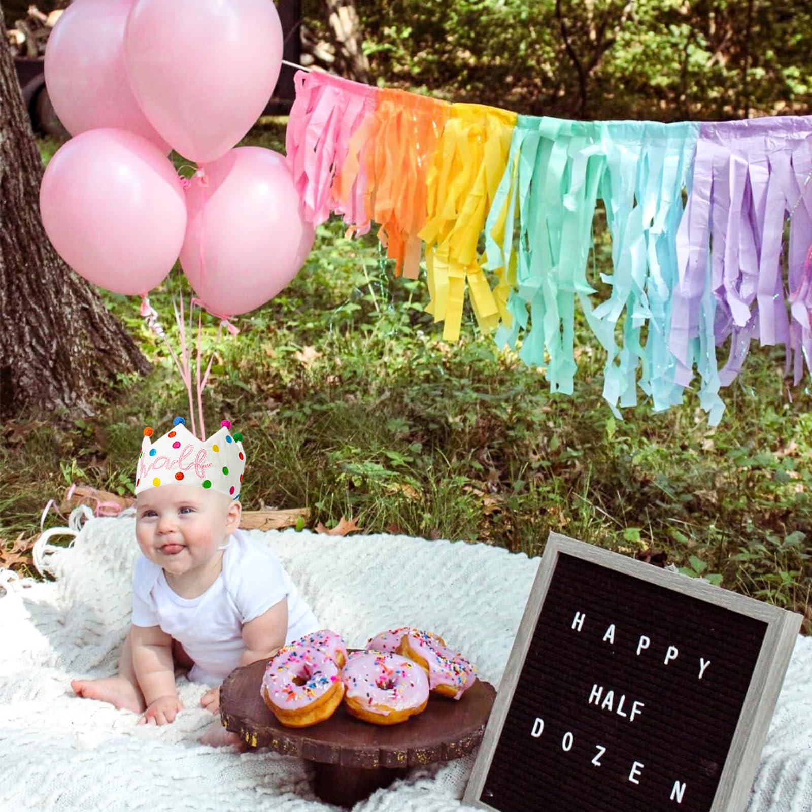 【Half Birthday Hat - Adjustable Cotton Ties 】- Worried that the crown might be too big or too small? Our birthday crown is adjustable. Sized 3.75 x 15 inches with darling cotton straps, it’s easy-peasy to tie and adjust, Even for 6 months baby! This isn't just a 1/2 birthday hat, it's also a precious souvenir. This isn't just a half birthday hat, it's also a glittering testament to growing up.Happy Half-Birthday! The perfect accessory for capturing those precious half-birthday memories.