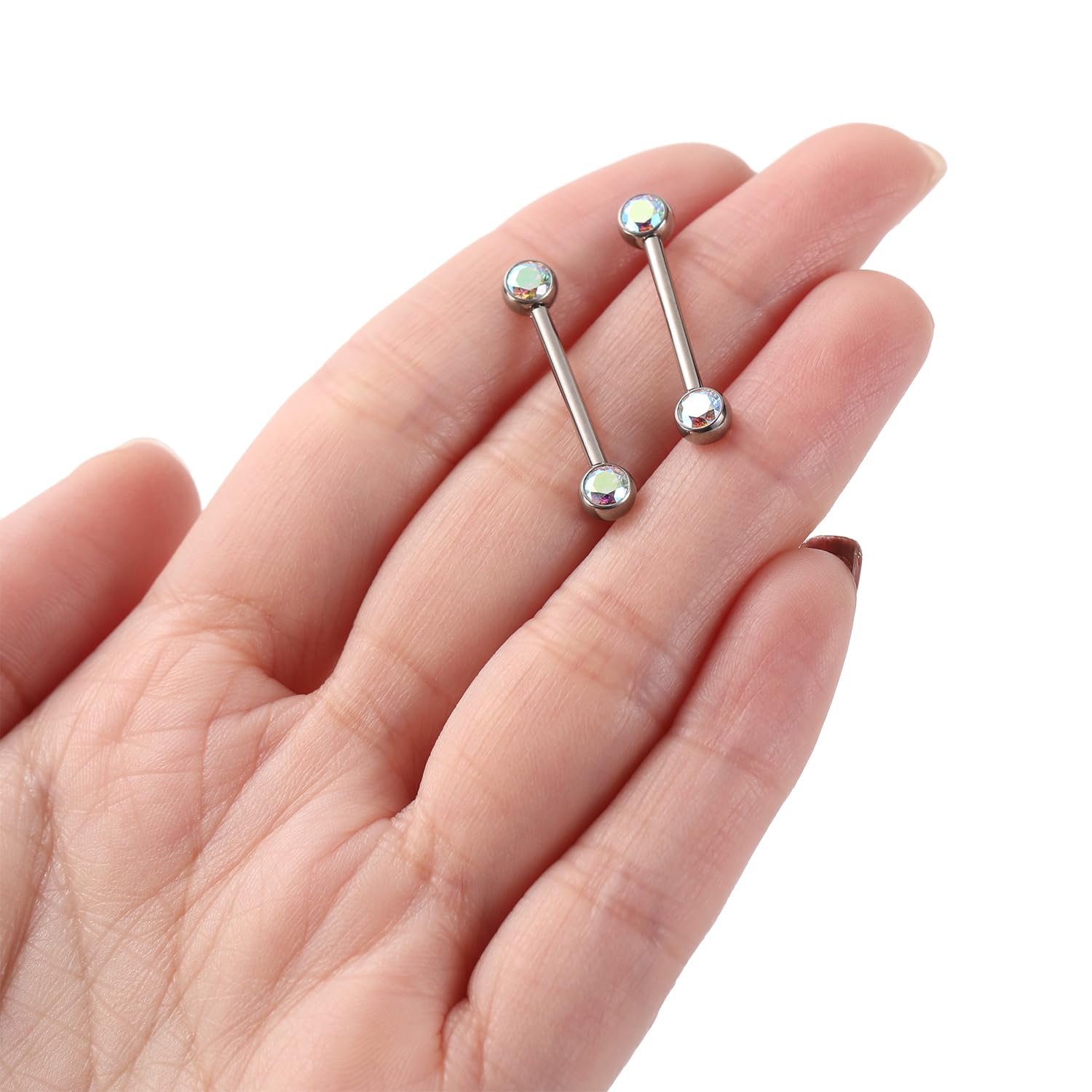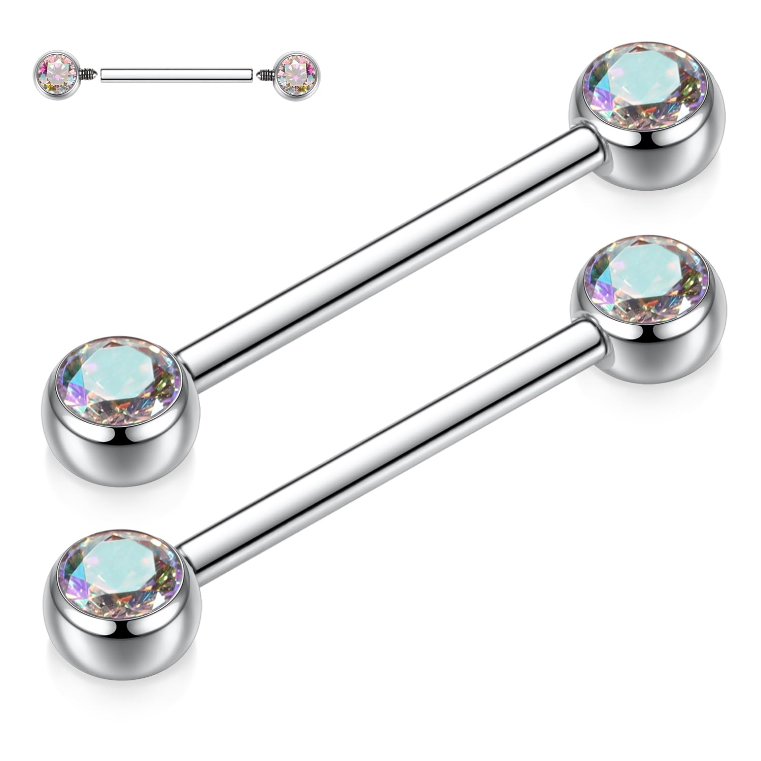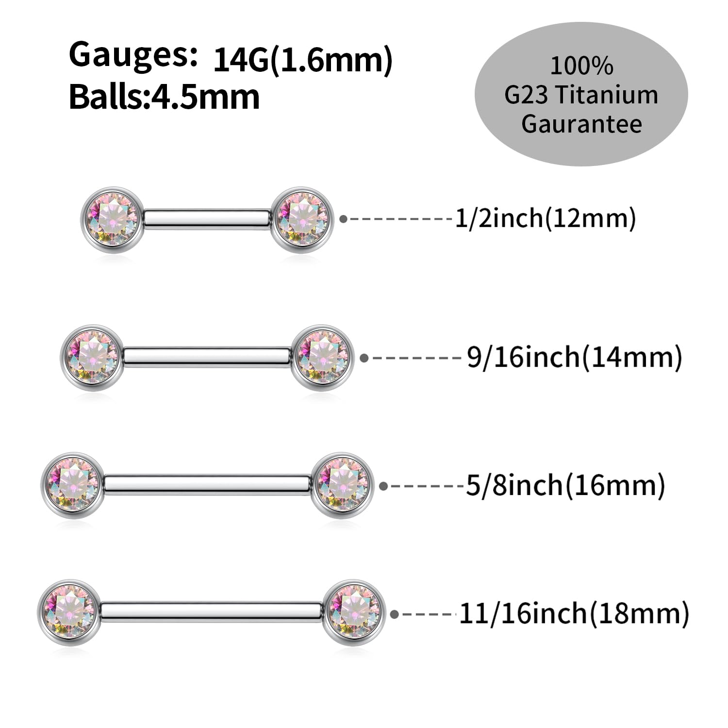 Size and Color: gauge: 14G (1.6 mm); Nipple Barbell Length: 1/2"(12 mm); CZ Size: 5 mm. Color: Silver with aurora borealis cube zircon. 2pcs nipple rings per order