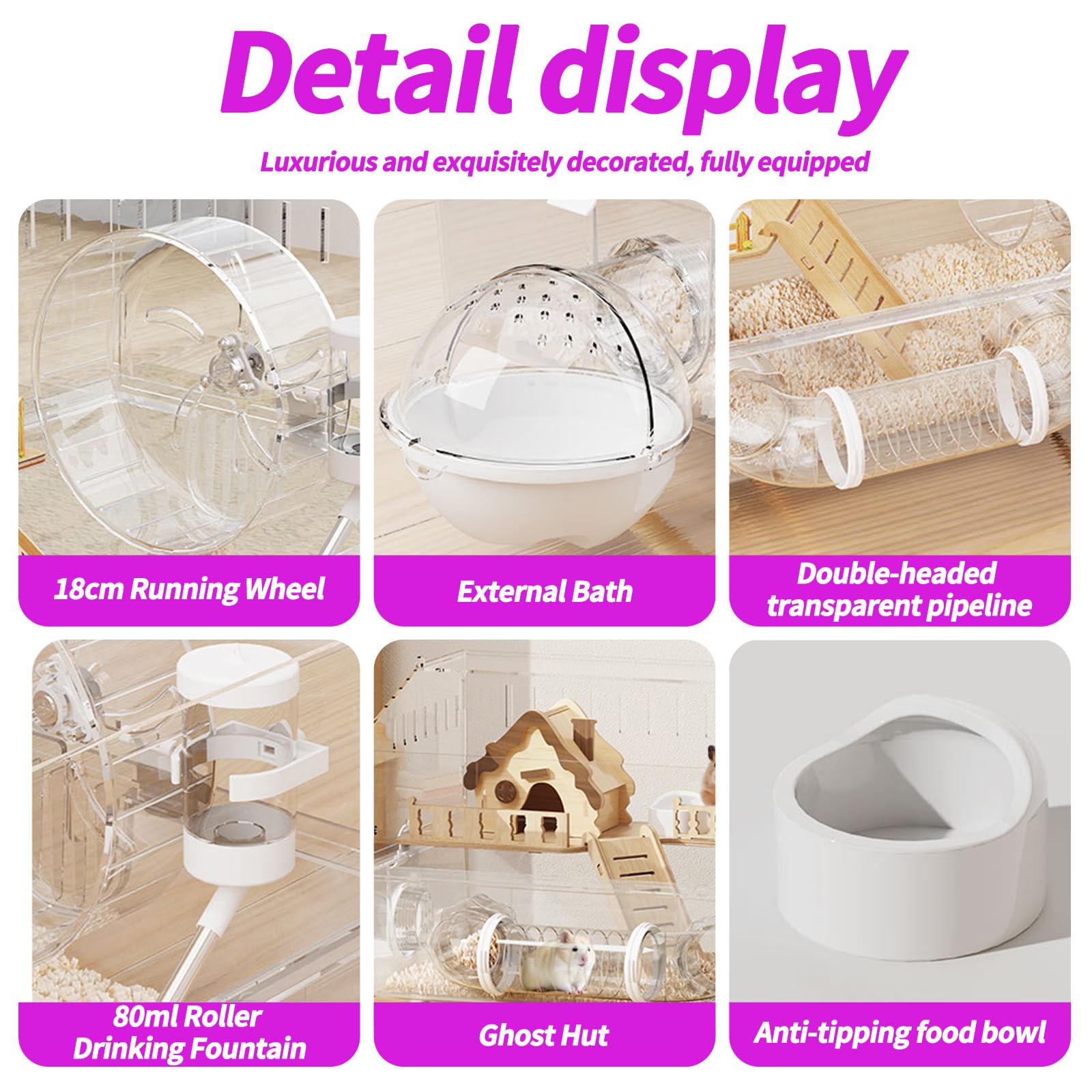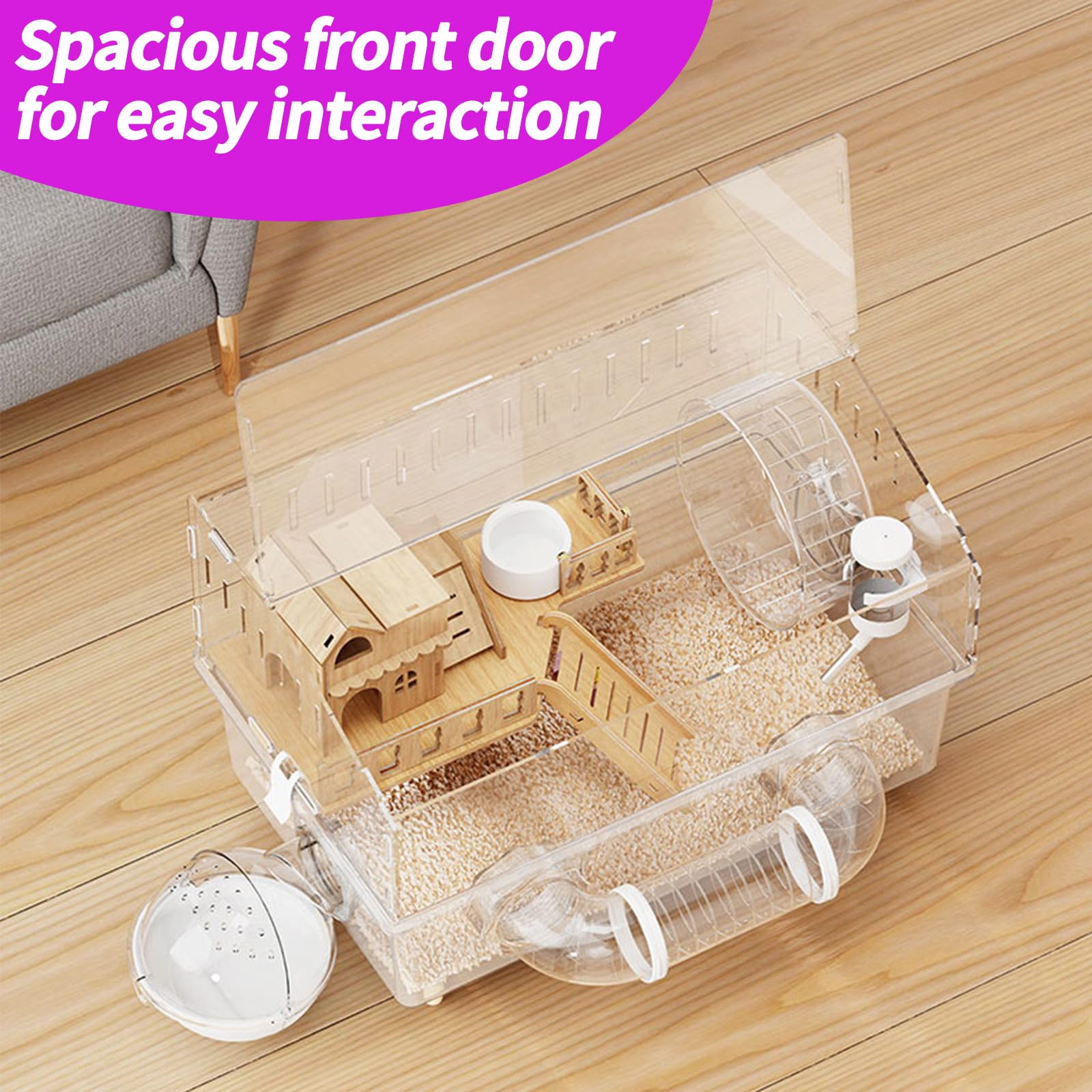 Hassle-Free Cleaning & Customization Removable base tray and wide doors enable quick cleaning. Effortlessly attach hamster houses, wheels, or dwarf hamster accessories without disassembling the main structure.