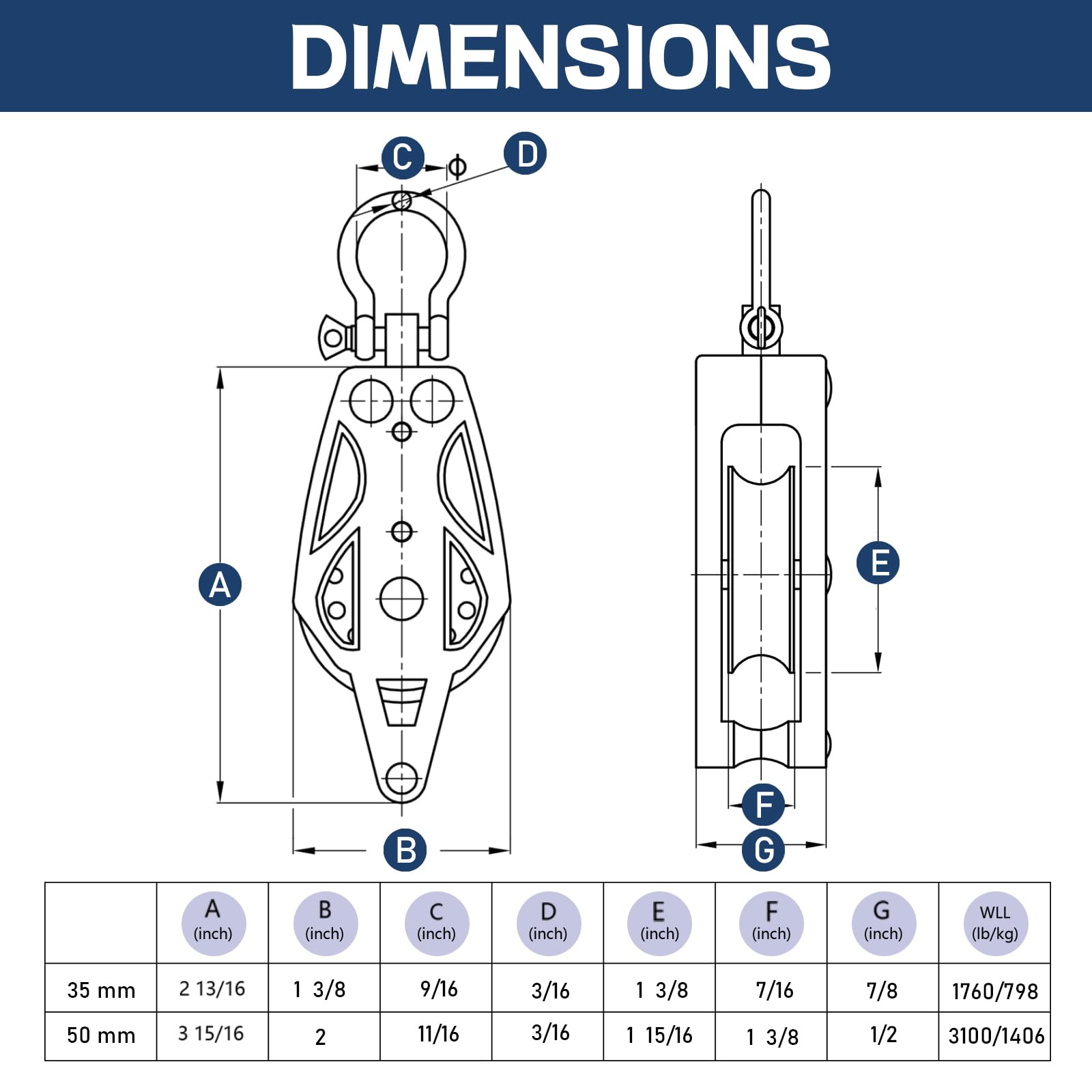 Precise Dimensions: Compact and lightweight with precise measurements - 315/16" (100mm) length, 2" (50.8mm) width, and 1 15/16" (49.2mm) sheave diameter. Designed to accommodate 1/2" (12mm) line, ensuring optimal fit and performance for various marine applications.