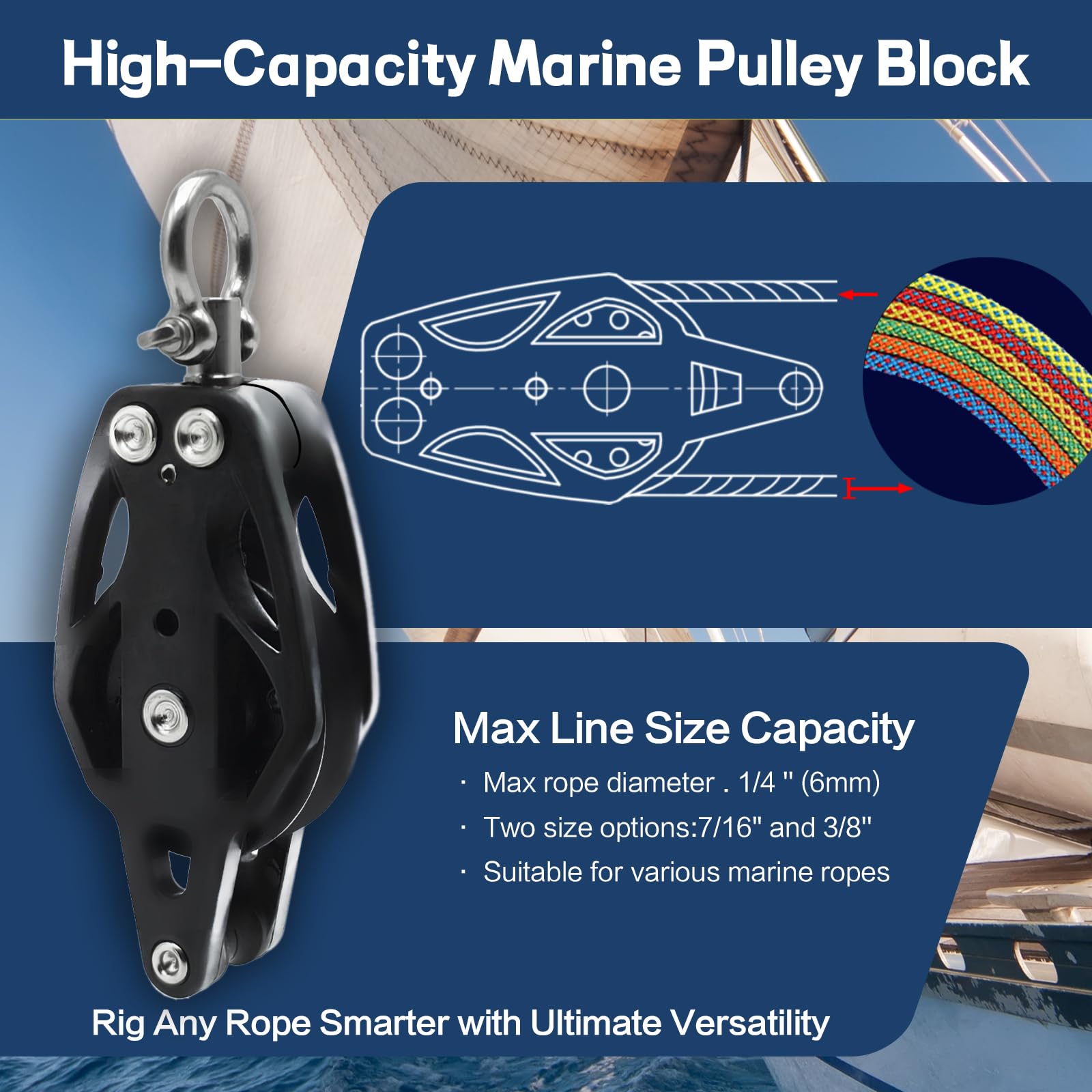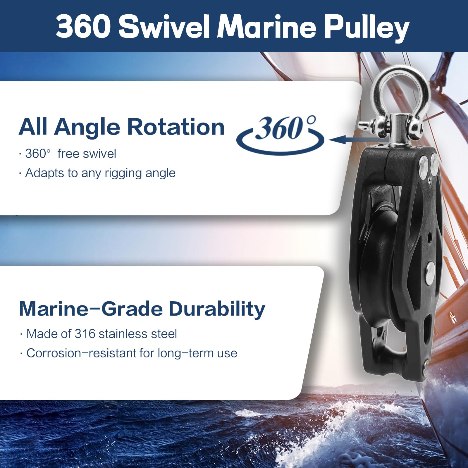 Versatile Swivel Design: The block features a swivel design, enhancing rigging versatility and reducing line twist; ideal for complex setups in sailing applications such as sheets, main/jib sheets, and control lines; providing adaptability in varied sailing environments.