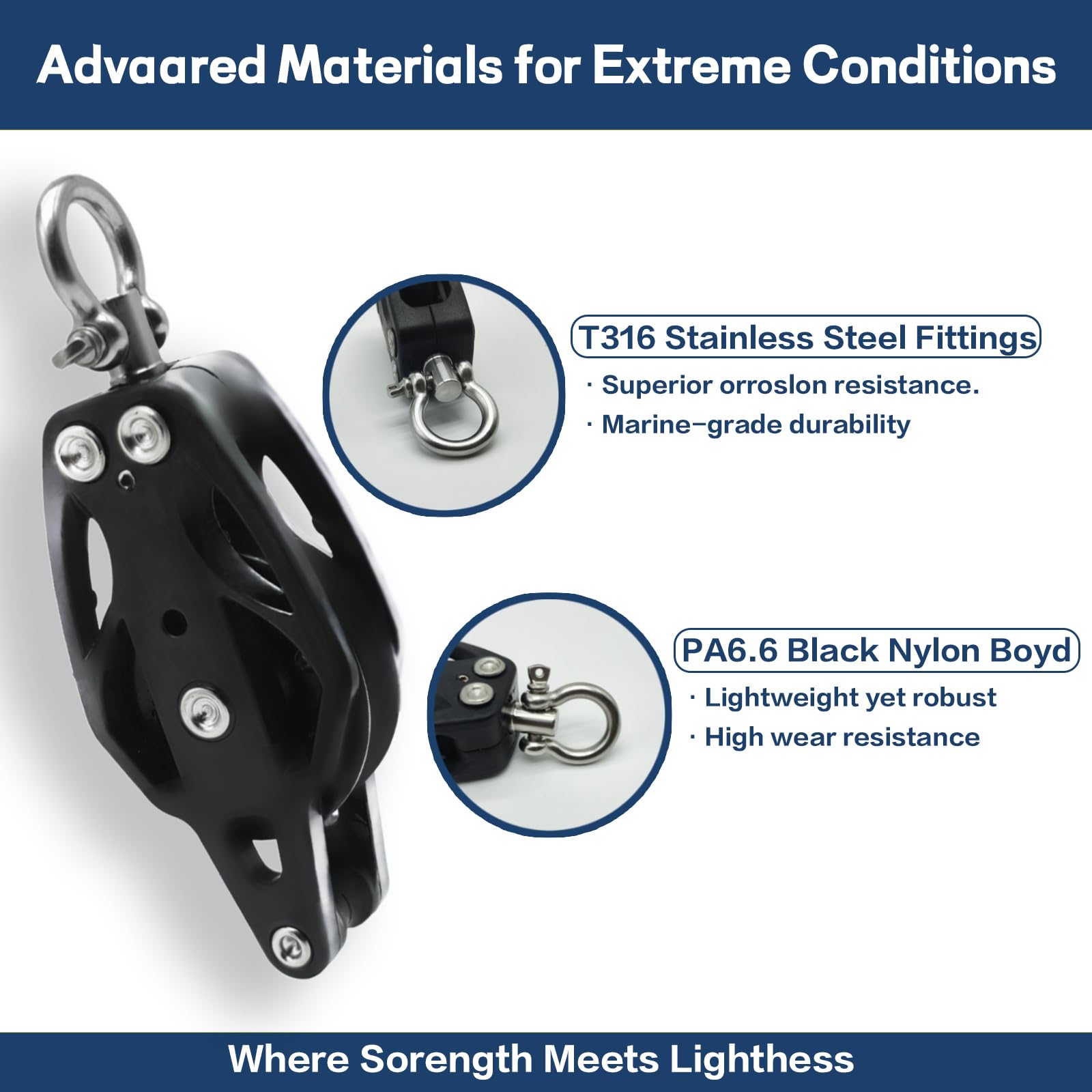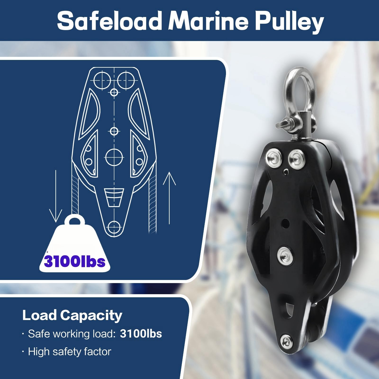 High Load Capacity: This block is capable of supporting a3100 lbs (1406 kg) breaking load; ideal for demanding marine and industrial tasks; ensures stable load management and reliable performance even under strenuous conditions