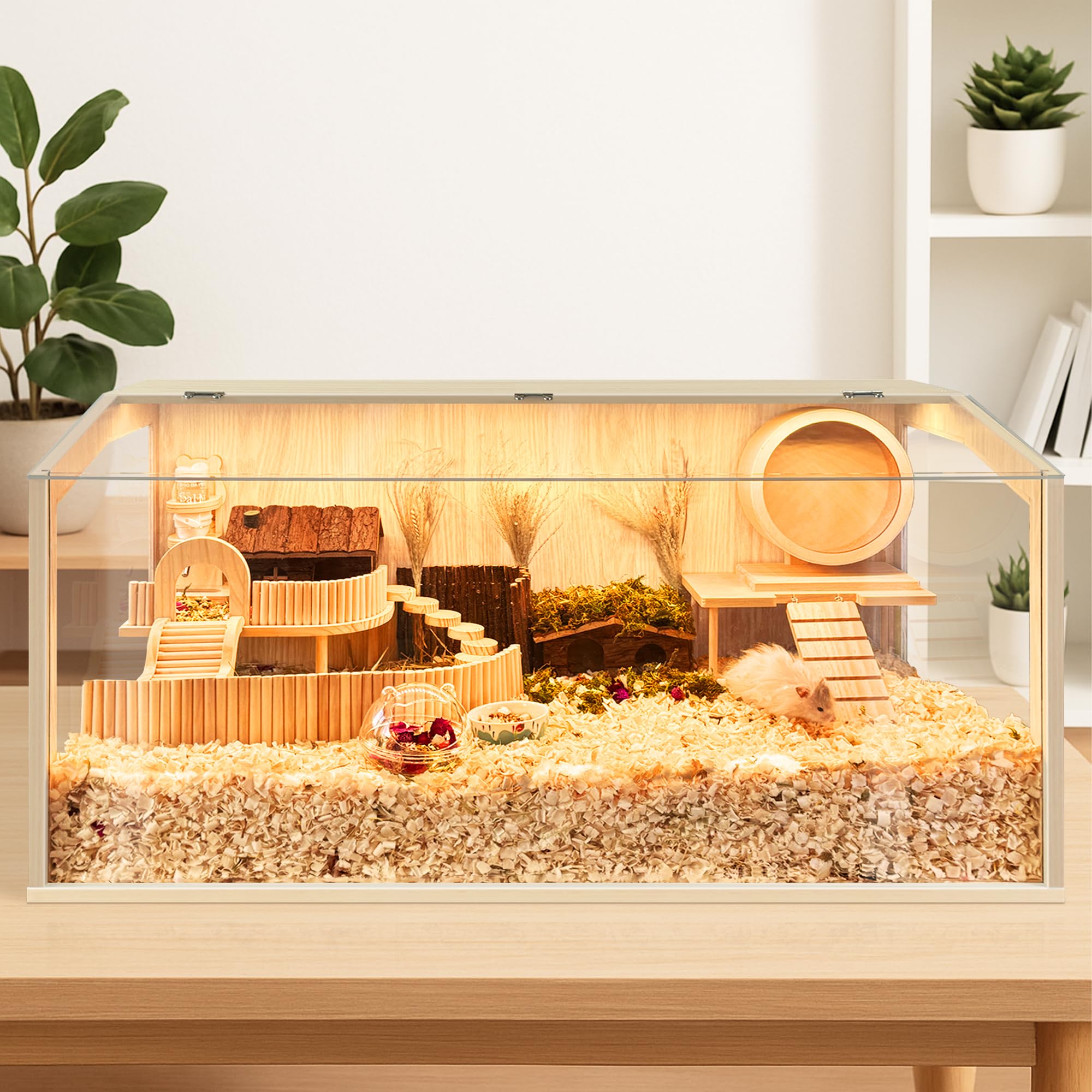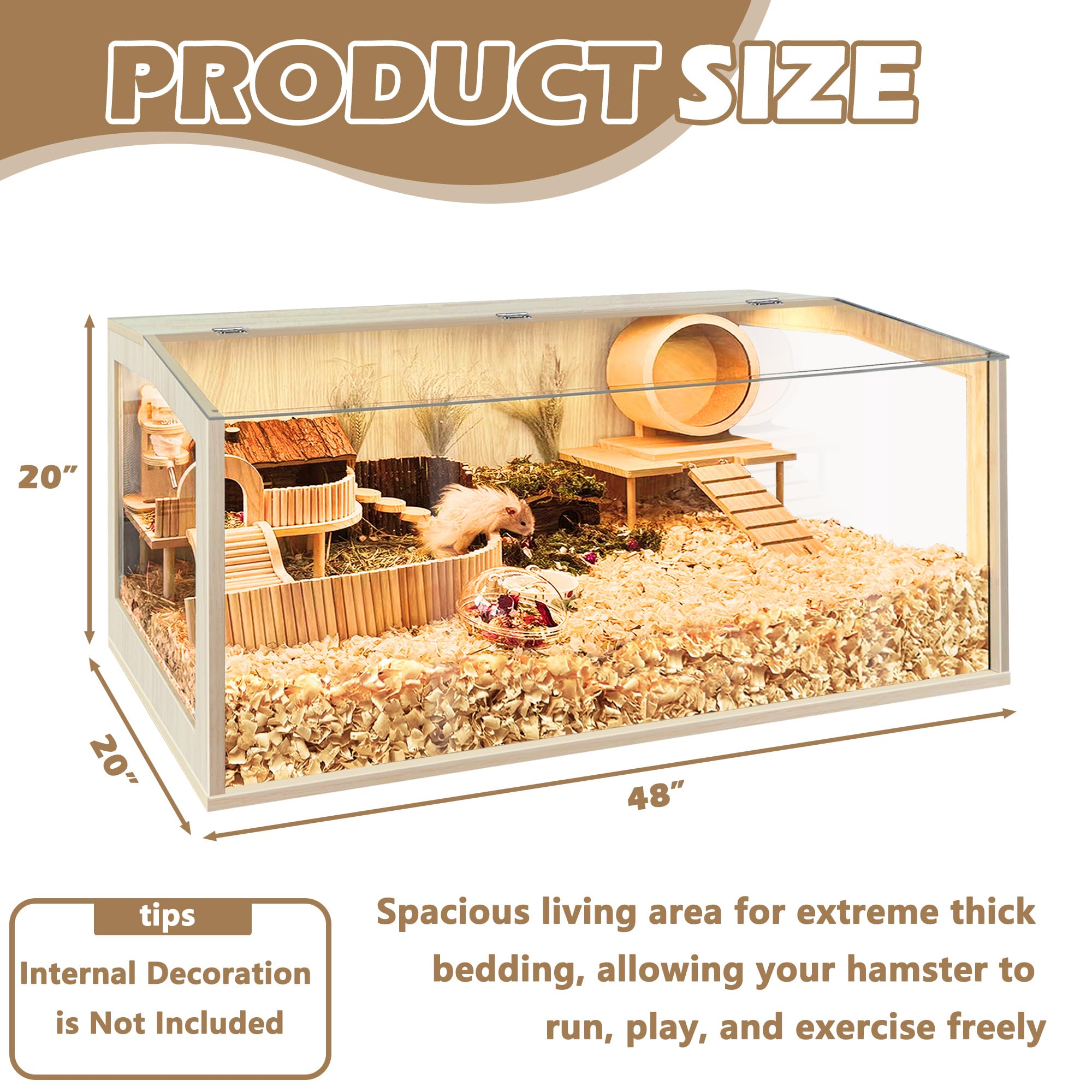 【Thick Bedding Matters】Research shows it’s best to have plenty of bedding so your hamsters can make a burrow just like they would in the wild. The extreme large interactive space of our cage is able to hold thick bedding and toy system for your pets to dig and explore. It's easy to arrange their hideout, sand bath area, hamster wheel, or exploring scene in the cage, which results in a far happier and less stressed hamster compare to the wire cage. We offer 4 different sizes, feel free to choose from 24-48in length. Note: The inner decoration is not included in the package