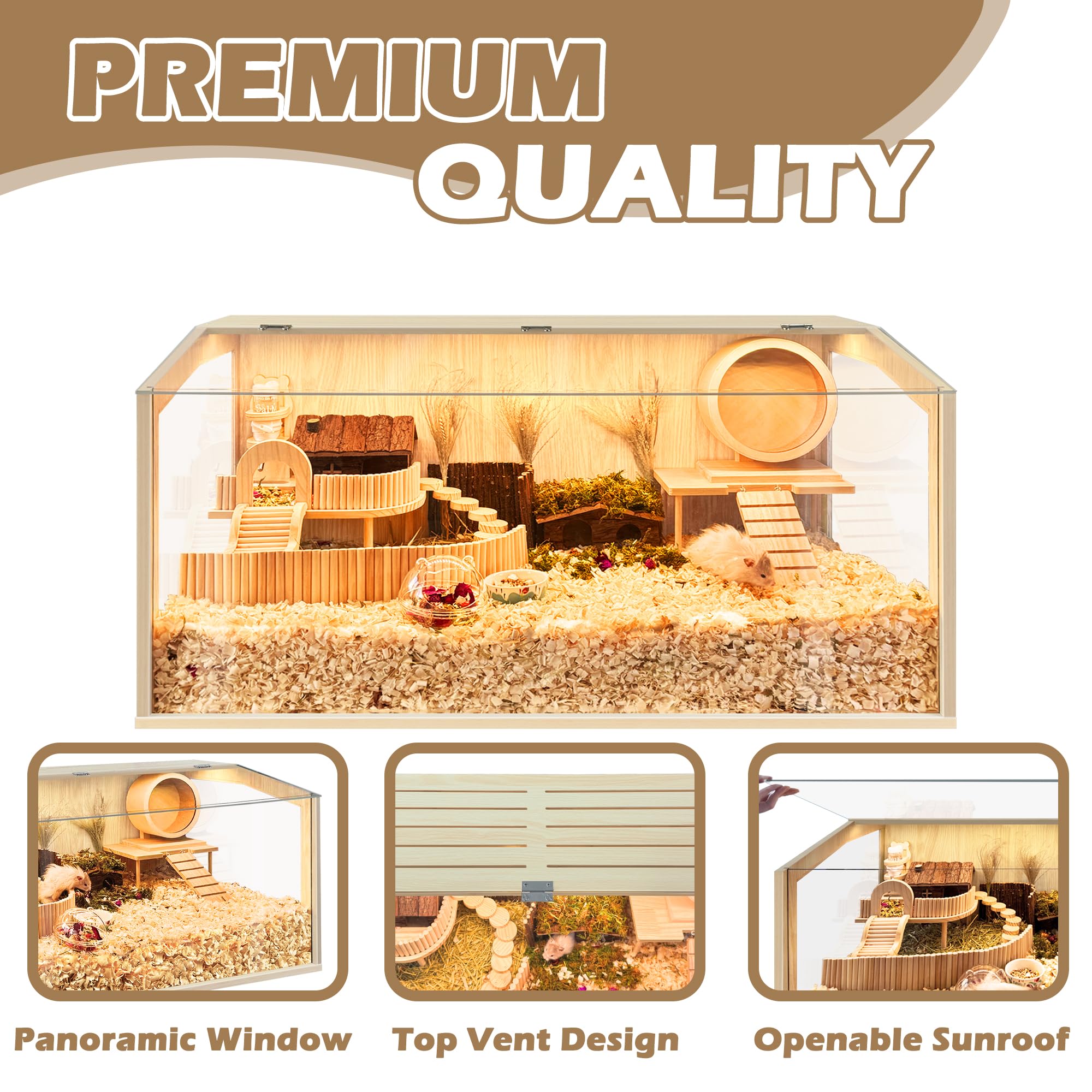【Premium Quality】Constructed with firm and high-density natural wood finished with rot & corrosion resistant and waterproof coating. The material of the windows are transparent acrylic panels, so that you can always have a clear view to observe the activities of your precious hamsters. It also comes with a clear acrylic sheet to place on the bottom of the cage, it avoids moisture and makes cleaning so much easier. This cage will be a great investment because of its long-lasting and aesthetic design.