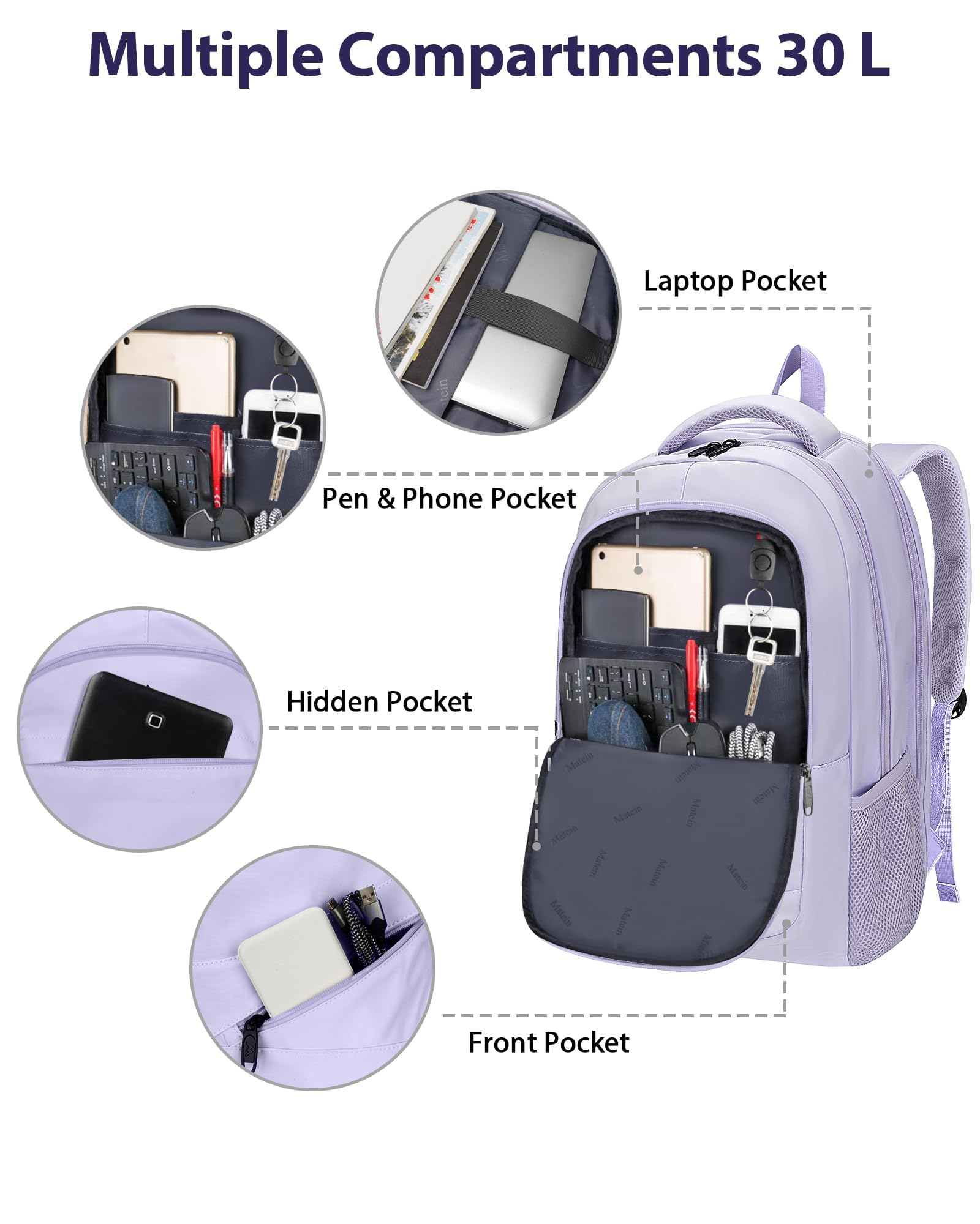 Multiple Pockets: Lightweight backpack for women has a separated laptop compartment for 15.6, 16, 17 inch notebook and tablet. Main compartment is roomy for office work files, travel clothes. Side mesh pockets hold water bottle or umbrellas. Back anti theft pocket protect wallets, passport. Ensuring the zipper is fully down with the puller at the bottom. This keeps your belongings safe from unexpected openings when you're walking