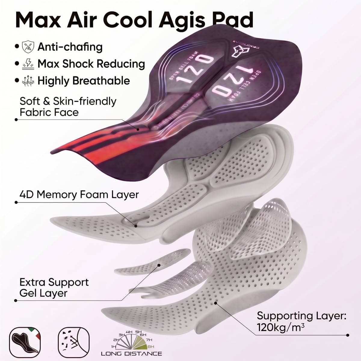 Long Distance pad. 120g/m2 Agis Shield open cell foam inserted on the sit-bone, best shock reducing and support. High breathable perforated construction enhance fresh and dry during your 8hours ride;