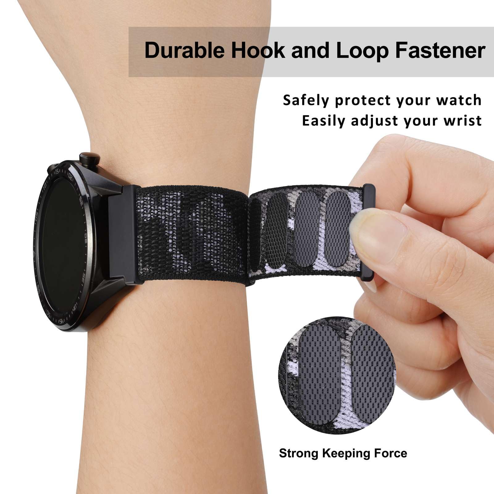 Adjustable: Fit wrist 14.5cm-22cm (5.7-8.6 inches). Adopt an durable Hook and Loop closure which can be cycled (opened and closed) thousands of times, allowing the watch to be fastened or adjusted in seconds.