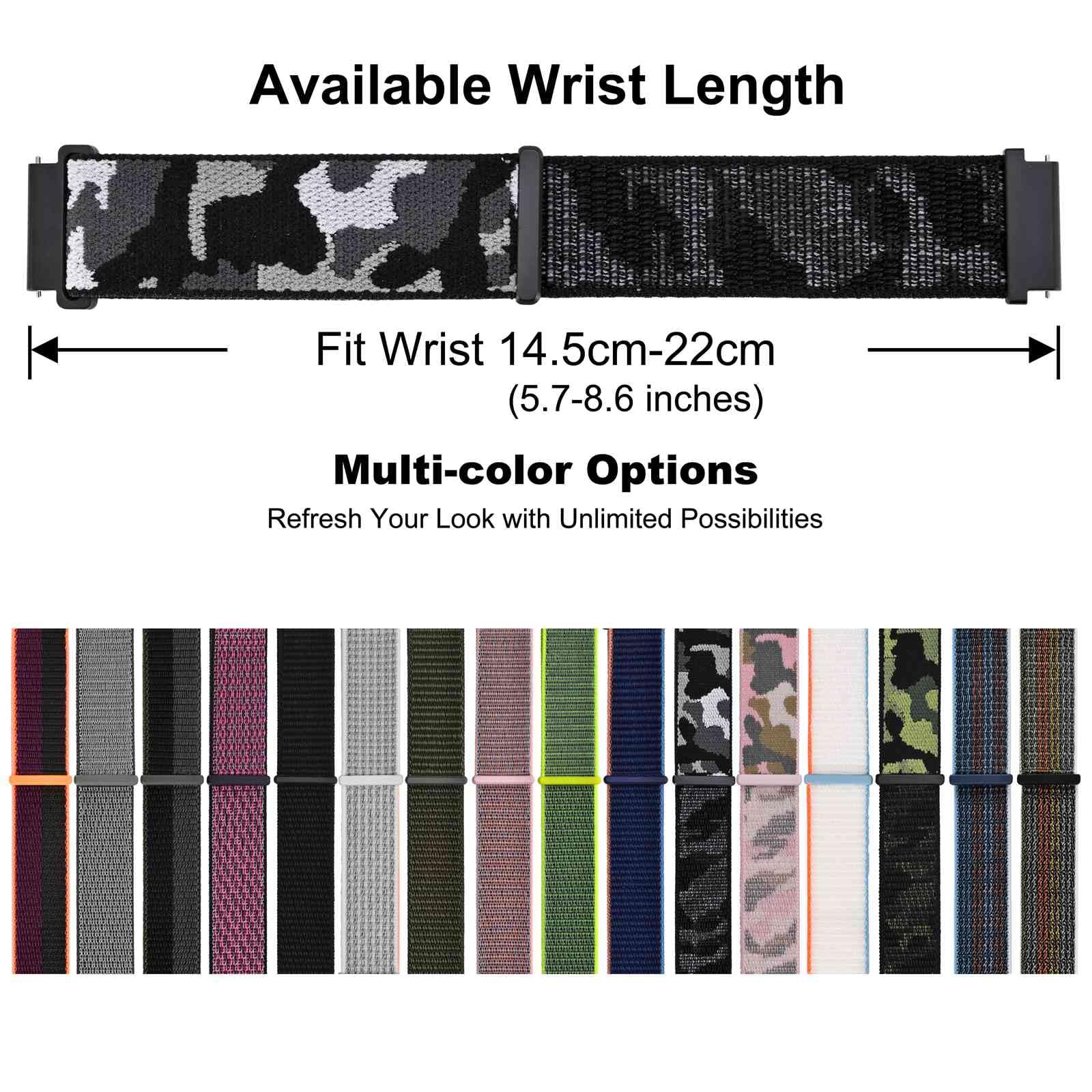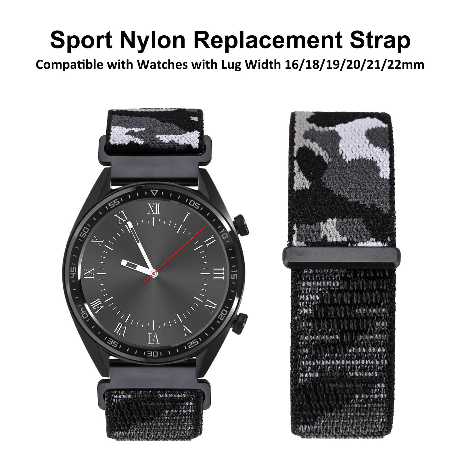 Band Width (Size): Standard 16mm, 18mm, 19mm, 20mm, 21mm, 22mm, 24mm. This watch band is compatible with all watches (including smart watches) with above band width. To determine the right size, use a ruler measure the interior distance between the two lugs on the watch case.