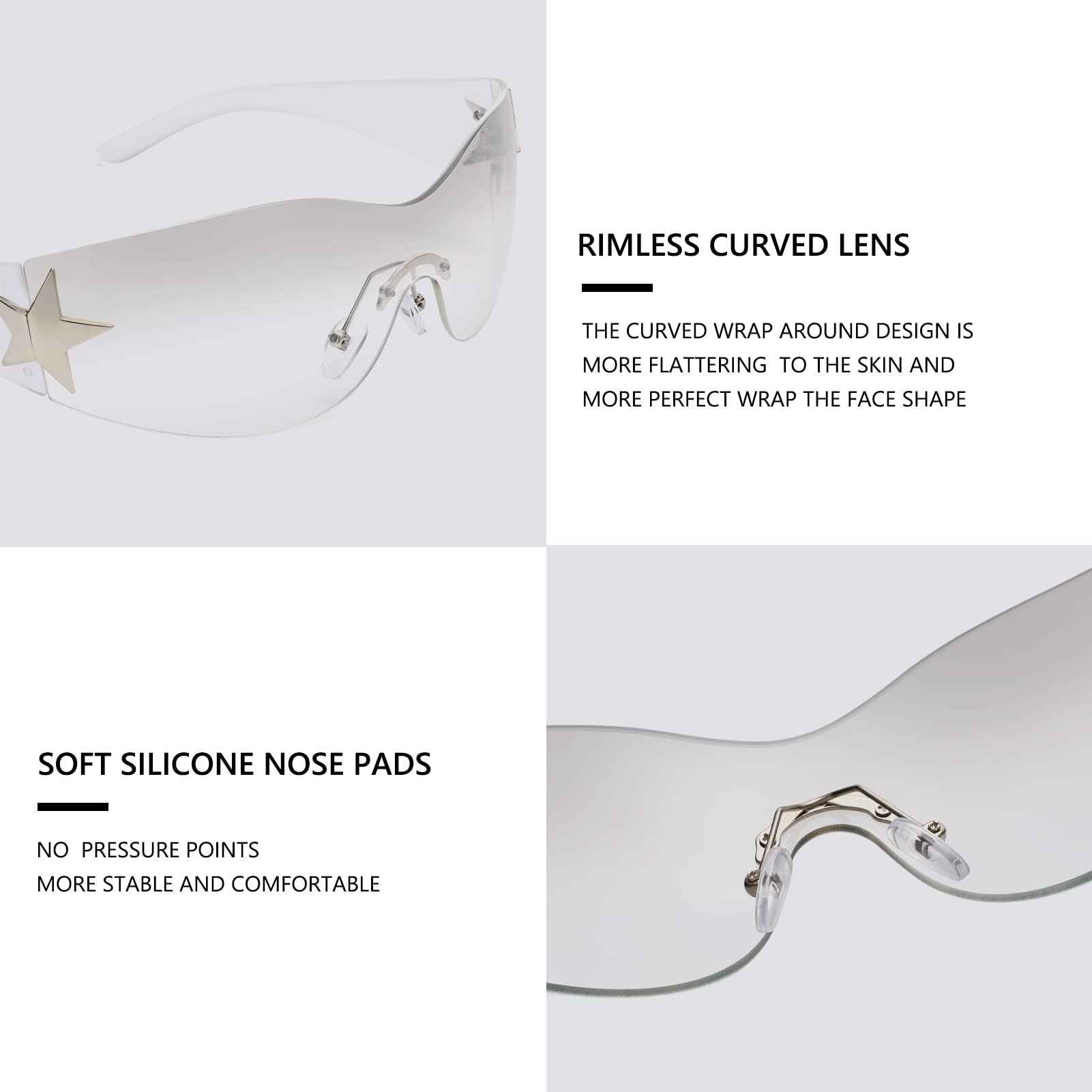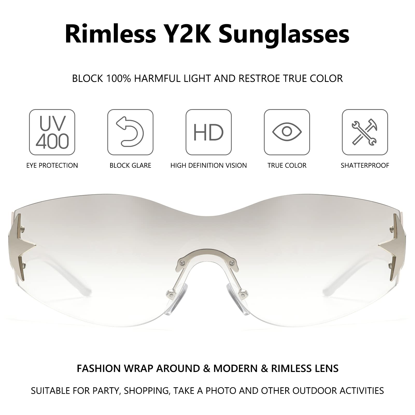 Rimless Y2K sunglasses for women, with a one-piece lens that wrap around the eyes in all direction, perfectly fits the contour of your face, full of futuristic technology and very fashionable