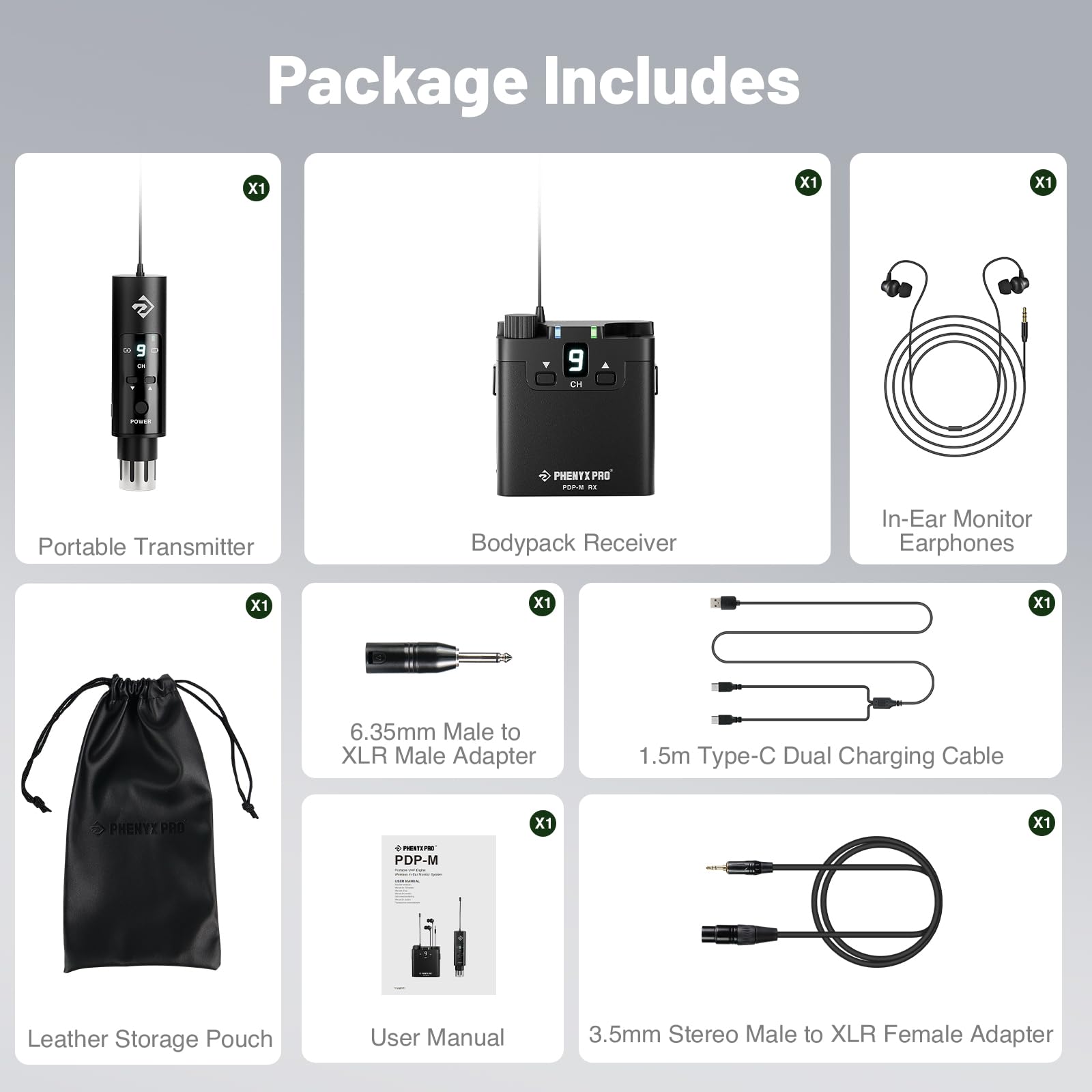 COMPLETE ACCESSORY KIT - Move freely with the portable transmitter and bodypack receiver. The 6.35mm male to XLR male adapter ensures compatibility with various output devices, while the 3.5mm male to XLR female adapter provides rich stereo monitoring. Charge both the transmitter and receiver simultaneously using the 1.5m Type-C dual charging cable. Experience instant monitoring with the in-ear monitor earphones, and keep your gear safe and organized on the go with the leather storage pouch