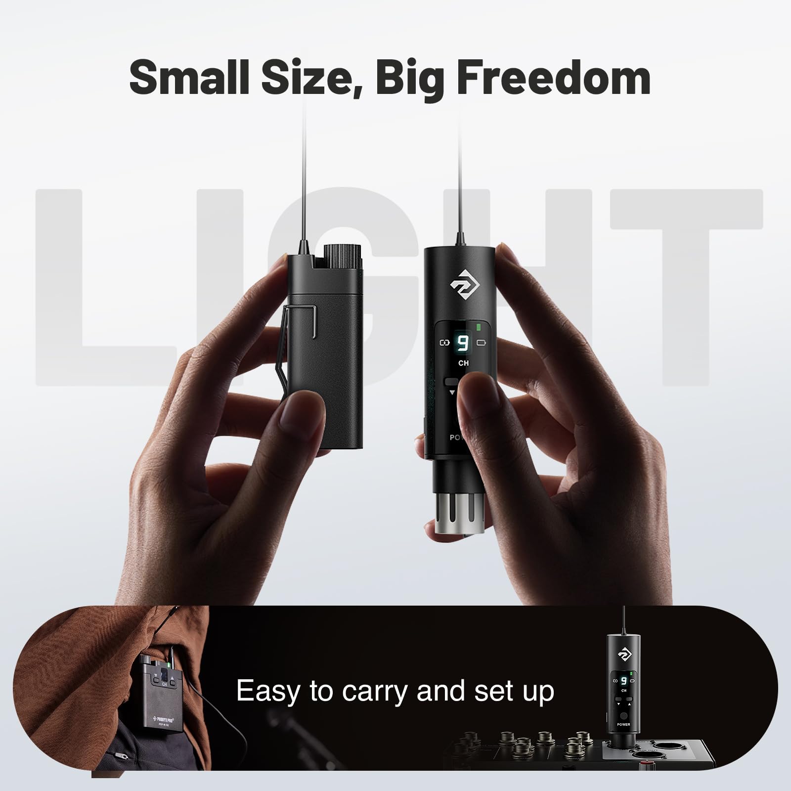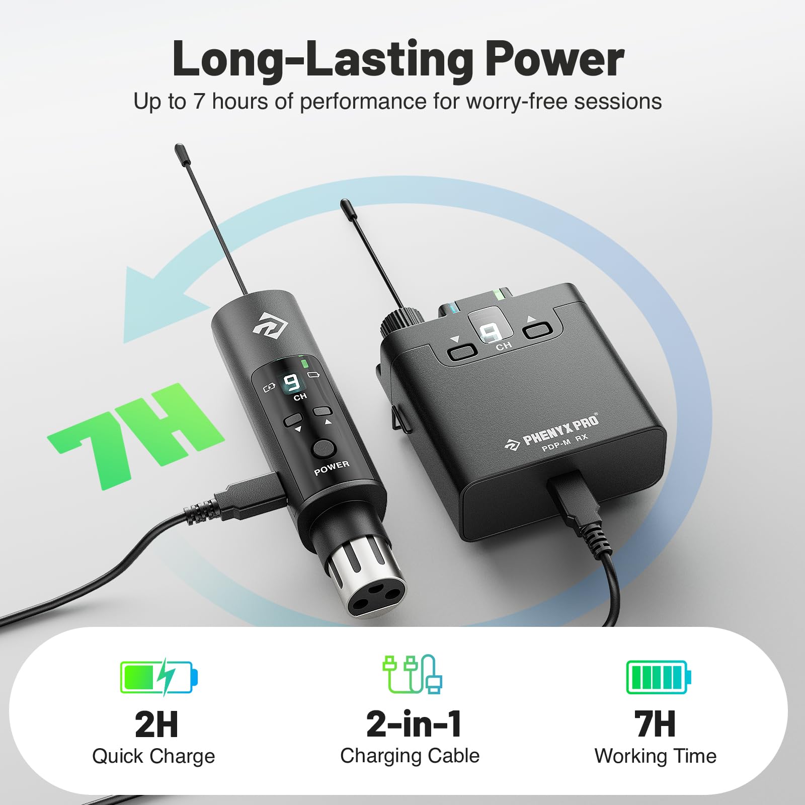 RELIABLE POWER ONSTAGE - Enjoy up to 7 hours of continuous use with the audio monitor's rechargeable lithium battery, ensuring reliable power throughout your event. The included Type-C dual charging cable charges both the transmitter and receiver at once, keeping you ready for every set. Compact and portable, the wireless monitor small in size yet delivers powerful, consistent performance, making it ideal for musicians and performers on the go