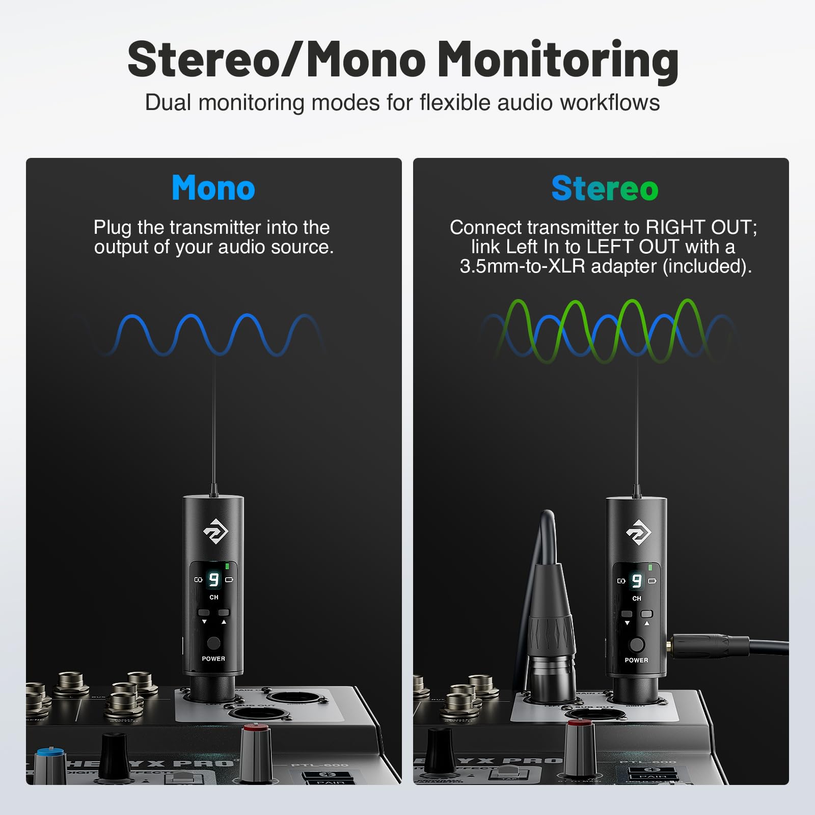 PROFESSIONAL STEREO MONITORING - Plug into your audio source using the transmitter's XLR input for clear, focused mono monitoring. For a richer listening experience, use the included 3.5mm to XLR adapter to link the transmitter’s 'Right In' with your audio source, enabling stereo monitoring with enhanced spatial awareness and precise audio localization. With the iem's dual XLR balanced inputs, you’re ensured high-quality signal transmission and seamless compatibility with professional gear