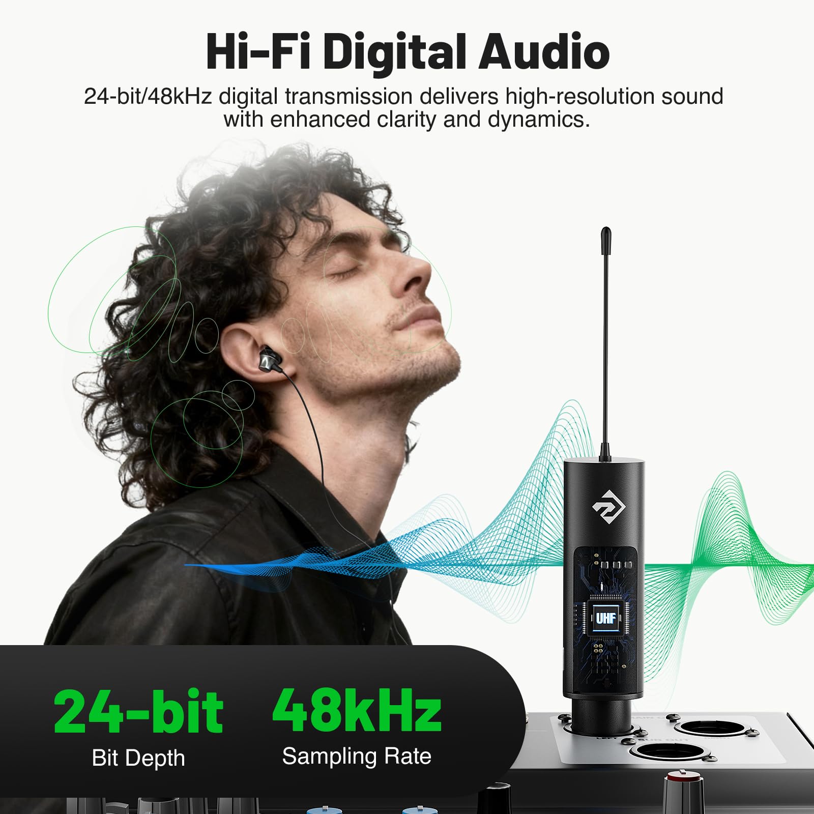 PRISTINE DIGITAL AUDIO - Featuring a digital signal path with 24-bit sampling depth and 48kHz sample rate, this wireless in-ear monitor system preserves the full dynamics and provides ultra-CD quality sound reproduction. Designed to meet the high standards of professionals in music, live sound, and broadcasting, the in ear monitor delivers crystal-clear audio with precise detail and clarity, fulfilling the most demanding audio quality requirements